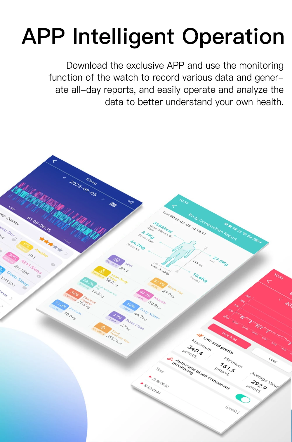 «Особенности блокбастера: измерение ЭКГ, анализ состава тела, анализ состава крови (Мочевая Кислота, Липиды), красный свет 24-часовой кислород крови, отчет о ВСР, 24-часовой научный сон, уровень сахара в крови четвертого поколения, мониторинг стресса в течение всего дня