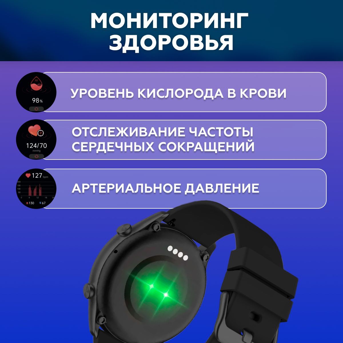 Встроенные датчики: GPS-трекер, Датчик артериального давления, Датчик движения, Датчик температуры тела, Датчик уровня кислорода в крови, Пульсометр, Тонометр, Термометр, Шагомер