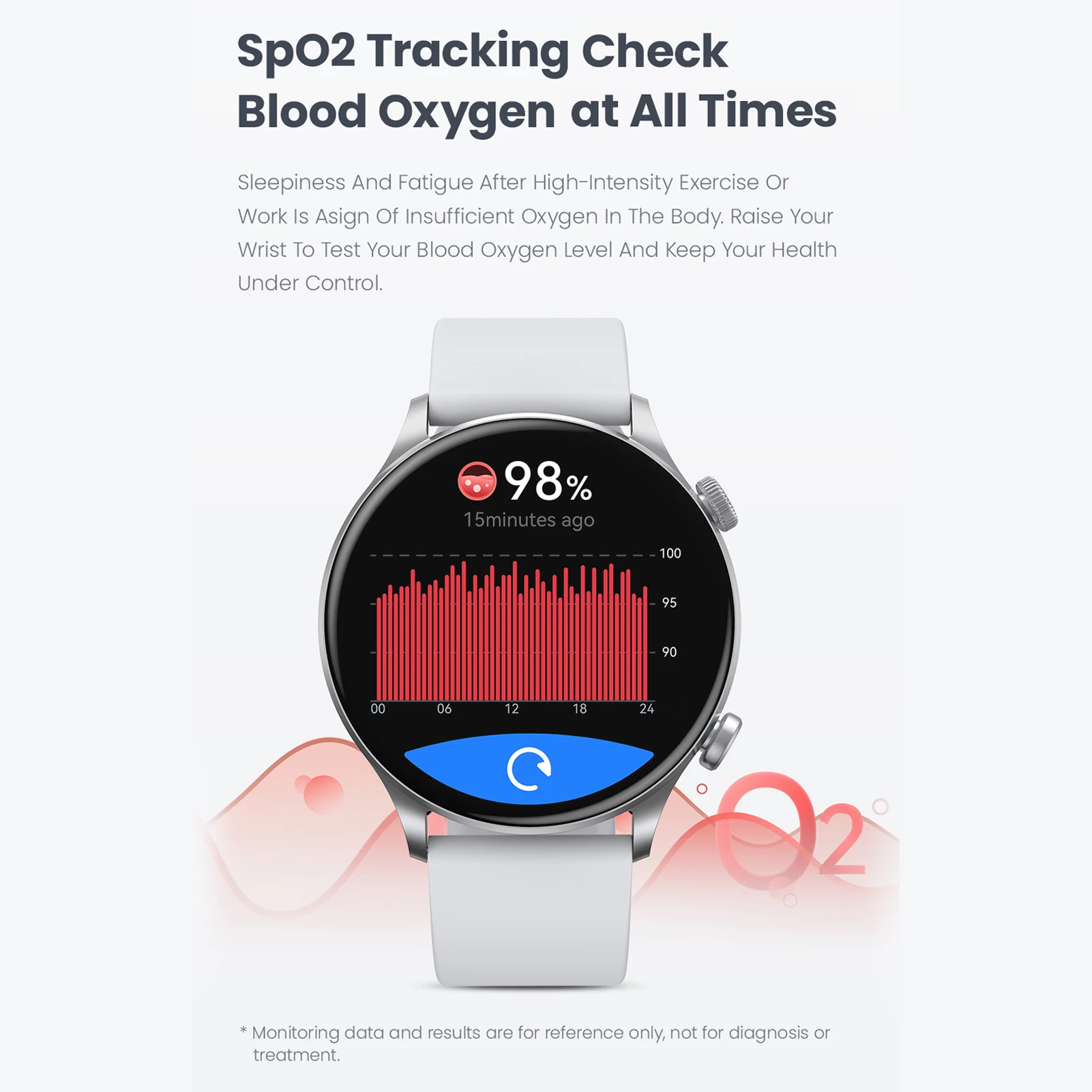 Эти умные часы могут постоянно проверять уровень кислорода в крови. Сонливость и усталость после интенсивных физических упражнений или работы являются признаком недостаточного кислорода в организме. Поднимите запястье, чтобы проверить уровень кислорода в крови и держать здоровье под контролем. Поддерживает 24-часовой мониторинг сердечного ритма, кривая сердечного ритма в реальном времени, душевное спокойствие для вас всегда онлайн.