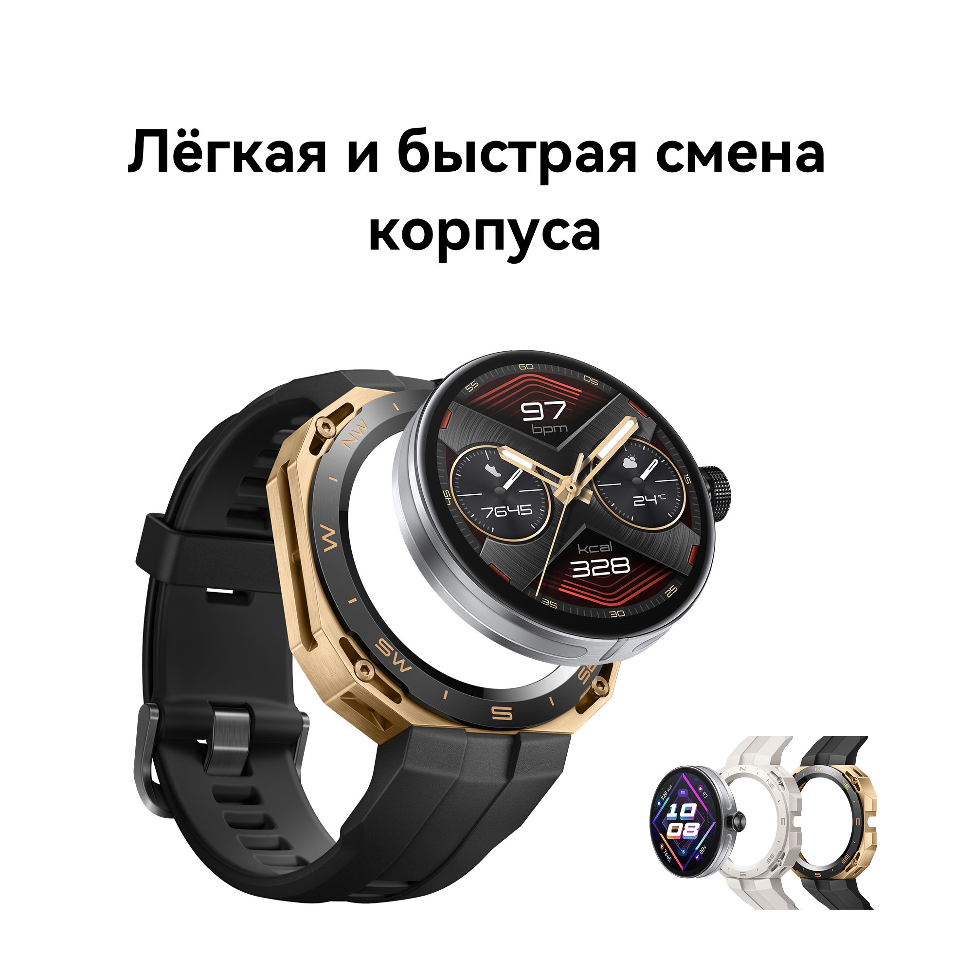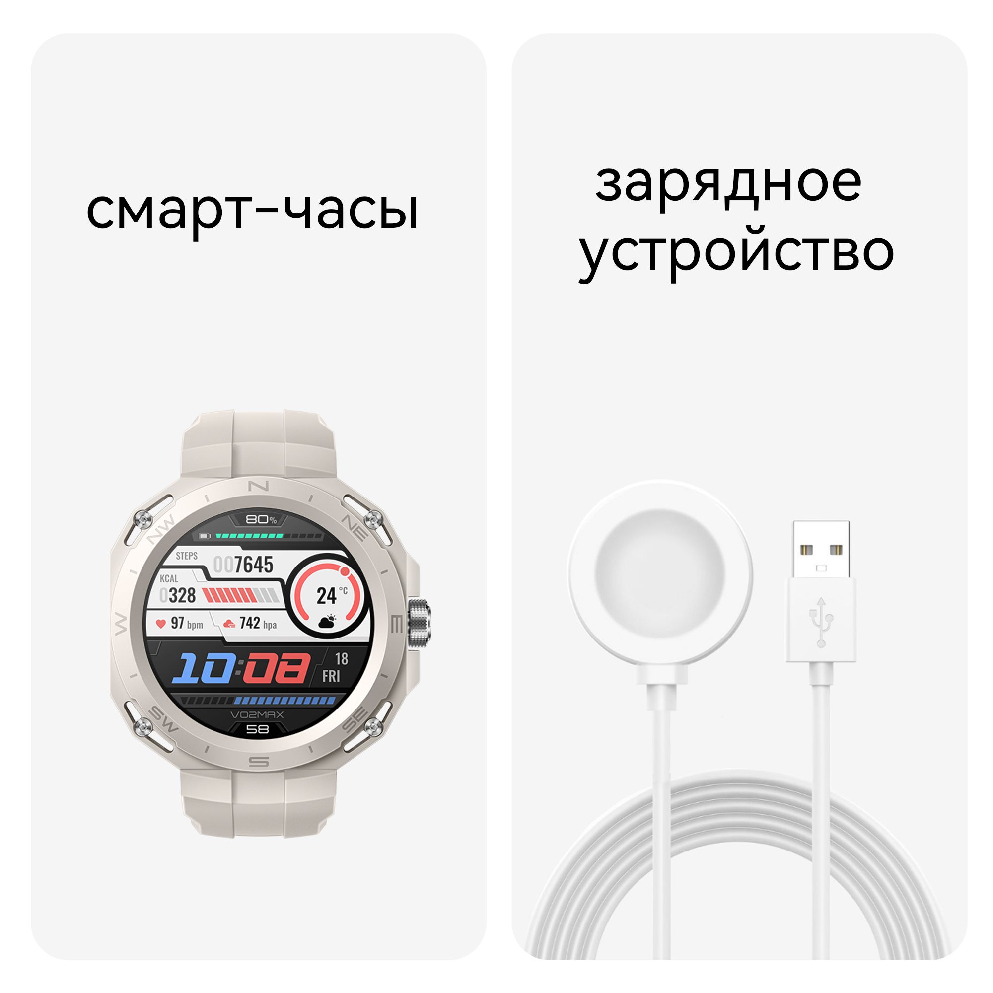 Часы (один внутренний корпус + внешний сменный корпус, состоящий из ремешка с креплением) Зарядная панель (включая кабель для зарядки) Краткое руководство пользователя и инструкция по технике безопасности Гарантийный талон