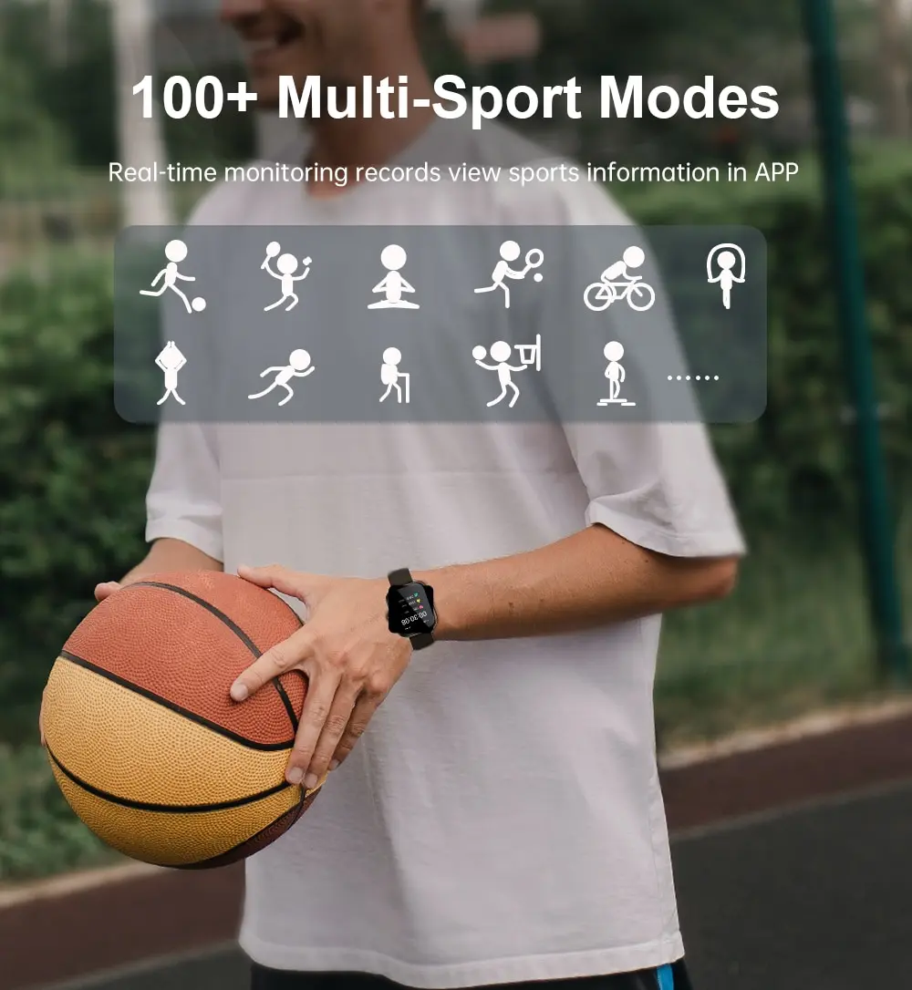• 100 + спортивных режимов :Часы предлагают широкий спектр спортивных режимов для отслеживания и мониторинга уровня активности, включая бег, езду на велосипеде и плавание.