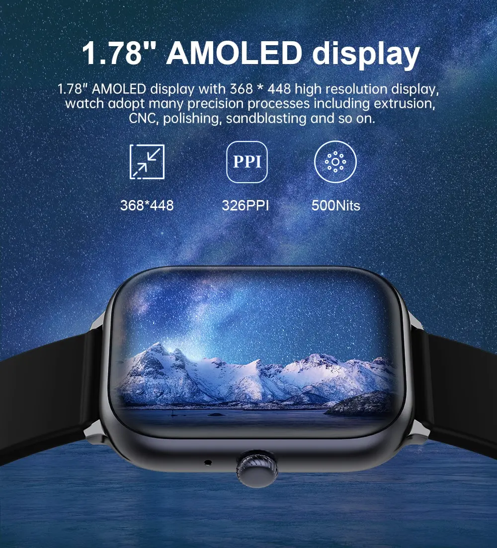 1,78-дюймовый AMOLED-дисплей с дисплеем с высоким разрешением 368*448, часы используют множество точных процессов, включая экструзию, ЧПУ, полировку, пескоструйную обработку и так далее.