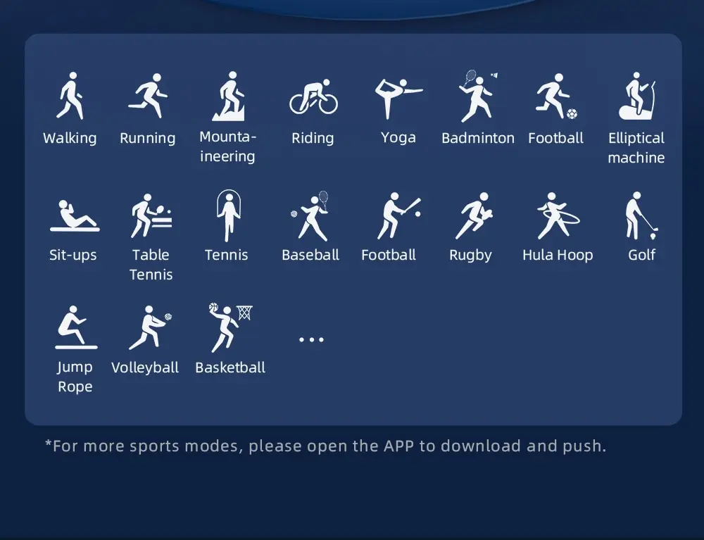 100 + спортивных режимов: бег, ходьба, езда на велосипеде, тренировка дыхания, бесплатные тренировки, доска, скакалка, Йога, альпинизм, пеший туризм, спиннинг, гребля, степпер, эллиптический, баскетбол, теннис, бадминтон, футбол, бейсбол, регби ........