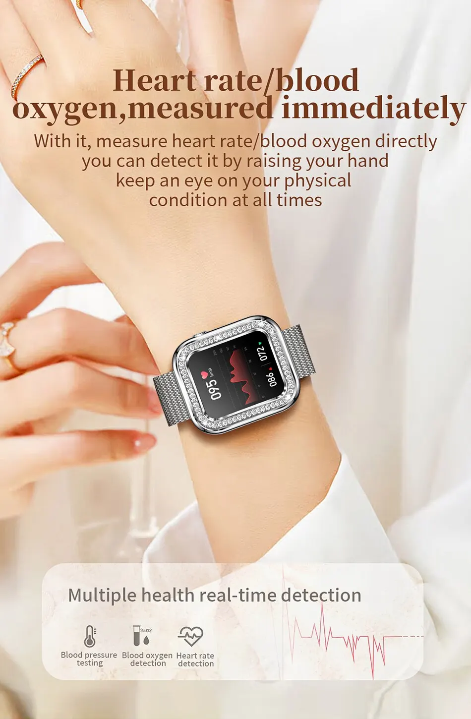 Поддержка мониторинга частоты сердечных сокращений/артериального давления/кислорода в крови и синхронизации данных с приложением. Множественные Циферблаты: