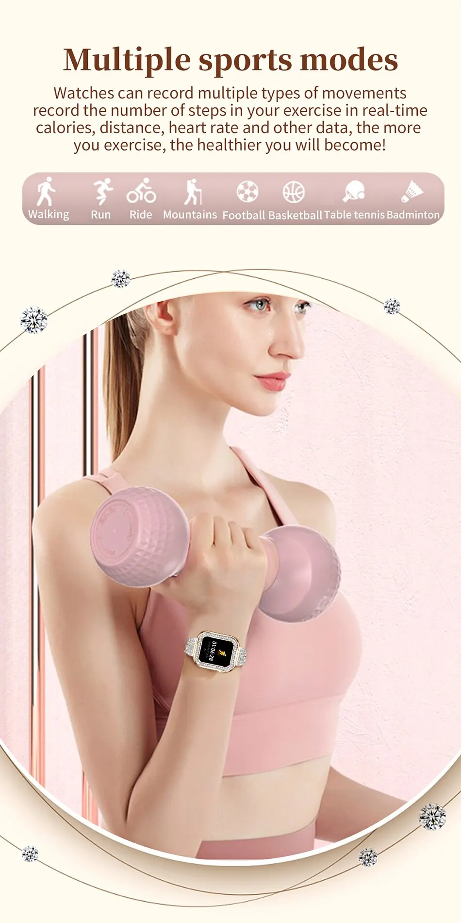 Множественные циферблаты, постоянно обновляемые. Вы также можете загрузить свою фотографию как циферблат часов. Спортивные режимы:
