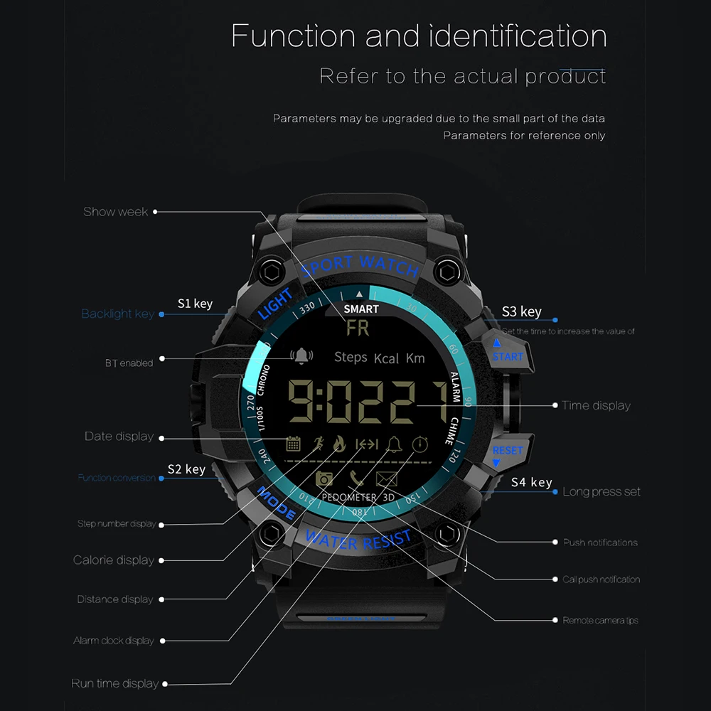 Функции: будильник, секундомер, трекер активности (количество шагов/количество сожженных калорий/расстояние), уведомление, удаленная камера, световой циферблат, автоматическое отображение времени (дата/неделя/час/минута/секунда), 12/24 часов.