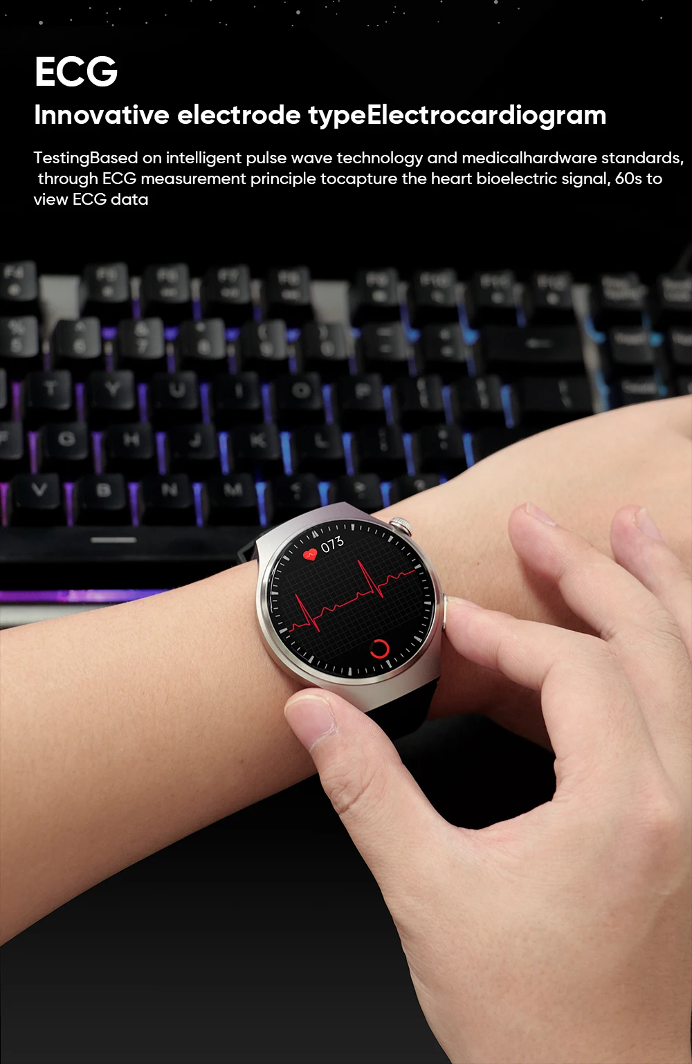 2. Электрокардиограмма, ЭКГ + ППГ (электрод + фотоэлектрический) тестирование частоты сердечных сокращений/электрокардиограммы/артериального давления. (Создайте отчет об ЭКГ HRV, воспроизведение ЭКГ)
