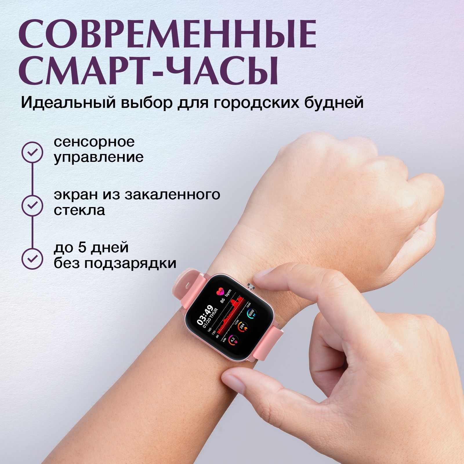 Описание: Умные часы являются незаменимым аксессуаром, который позволяет всегда оставаться на связи. Они имеют лаконичный и минималистичный дизайн, что дает возможность носить их как женщинам, так и мужчинам. Электронные часы на руку выполнены из высококачественного материала, ремешок сделан из силикона, плотно прилегающий к запястью. Этот гаджет заботится о здоровье в режиме реального времени: измеряет артериальное давление, контролирует частоту пульса, анализирует качество сна. Часы для спорта имеют удобный прямоугольный циферблат, изогнутый дисплей и способны держать заряд до 5 дней. Мужские спортивные часы будут верным помощником во время тренировок, фитнеса, бега, велоспорта, скандинавской ходьбы. Они обладают защитой от влаги и пыли, что позволяет носить их в любую погоду. Смарт часы оснащены дополнительными опциями, а именно: прием звонков и набор номеров, будильник, чтение уведомлений и сообщений прямо с сенсорного экрана. Детские часики имеют встроенный GPS-трекер, который позволяет отслеживать местоположение и прокладывать маршруты. Этот аксессуар будет элегантным дополнением как для повседневного образа, так и для праздничного мероприятия. Водонепроницаемый фитнес браслет напомнит о разминке, а шагомер и счетчик калорий будут служить мотиватором для подвижного времяпрепровождения.