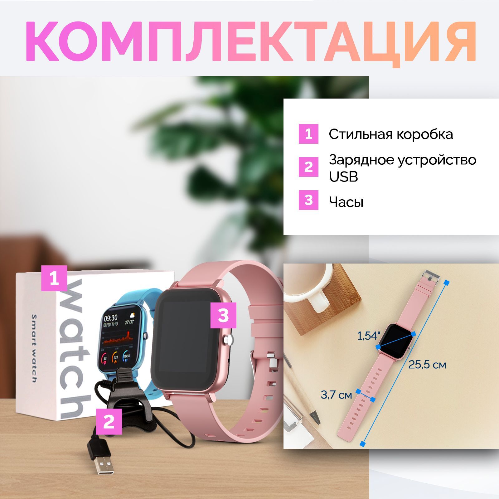 Смарт часы - 1 шт.; зарядное устройство - 1 шт.; инструкция; упаковка