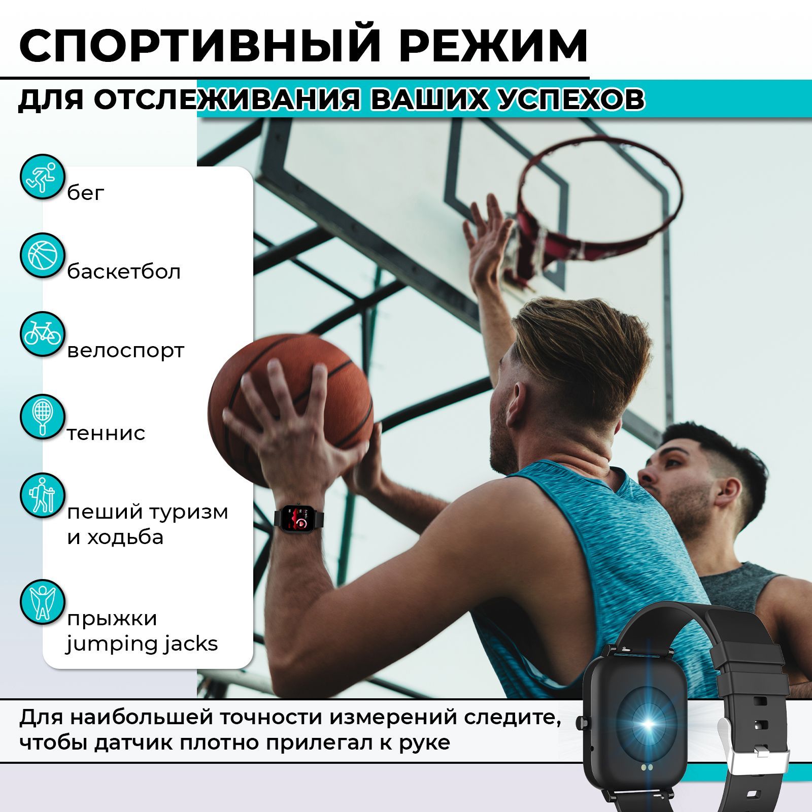 Встроенные датчики: GPS-трекер, Датчик артериального давления, Пульсометр, Счетчик калорий, Шагомер