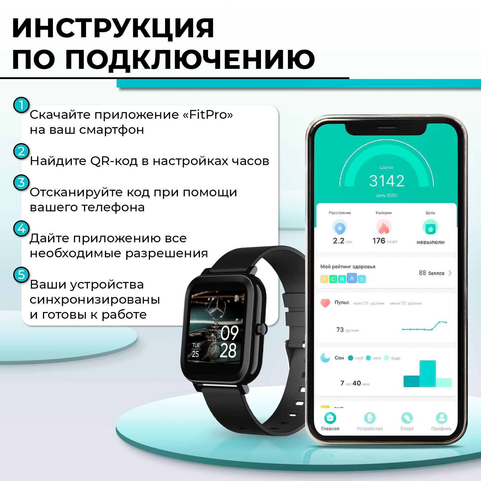 Мониторинг: Усвоения калорий, Сердечного ритма, Сна, Физической активности