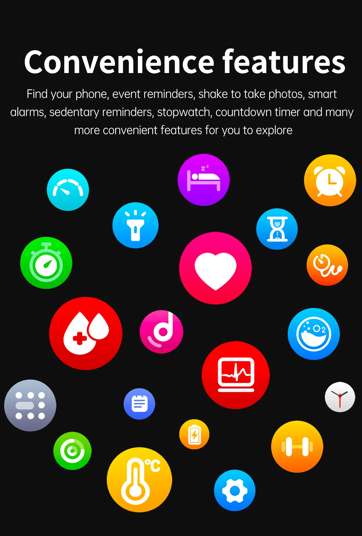 Панггилан Bluetooth \ ЭКГ, ЭКГ + PPG \ пемантауан суху \ пемантау глюкоса Дарах \ денют джантунг, теканан Дарах, оксиген Дарах, пемантауан Вакту Нята теканан \ пемантау тидур \ секундомер, Центер, таймер hitung mundur, шагомер, калори, джарак, пемантауан тидур, режим латихан, пингингингат панггилан масук, Сигнализация джема pengingat, pengingat menetap, Terangkat Tangan untuk menyalakan layar, berbagi sosial (WeChat, QQ, Facebook, Twitter), DLL.