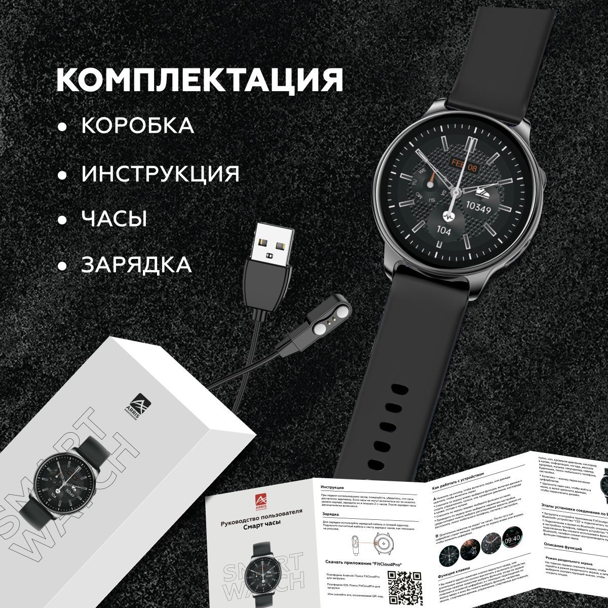 Смарт часы, коробка, инструкция на русском языке, зарядный кабель