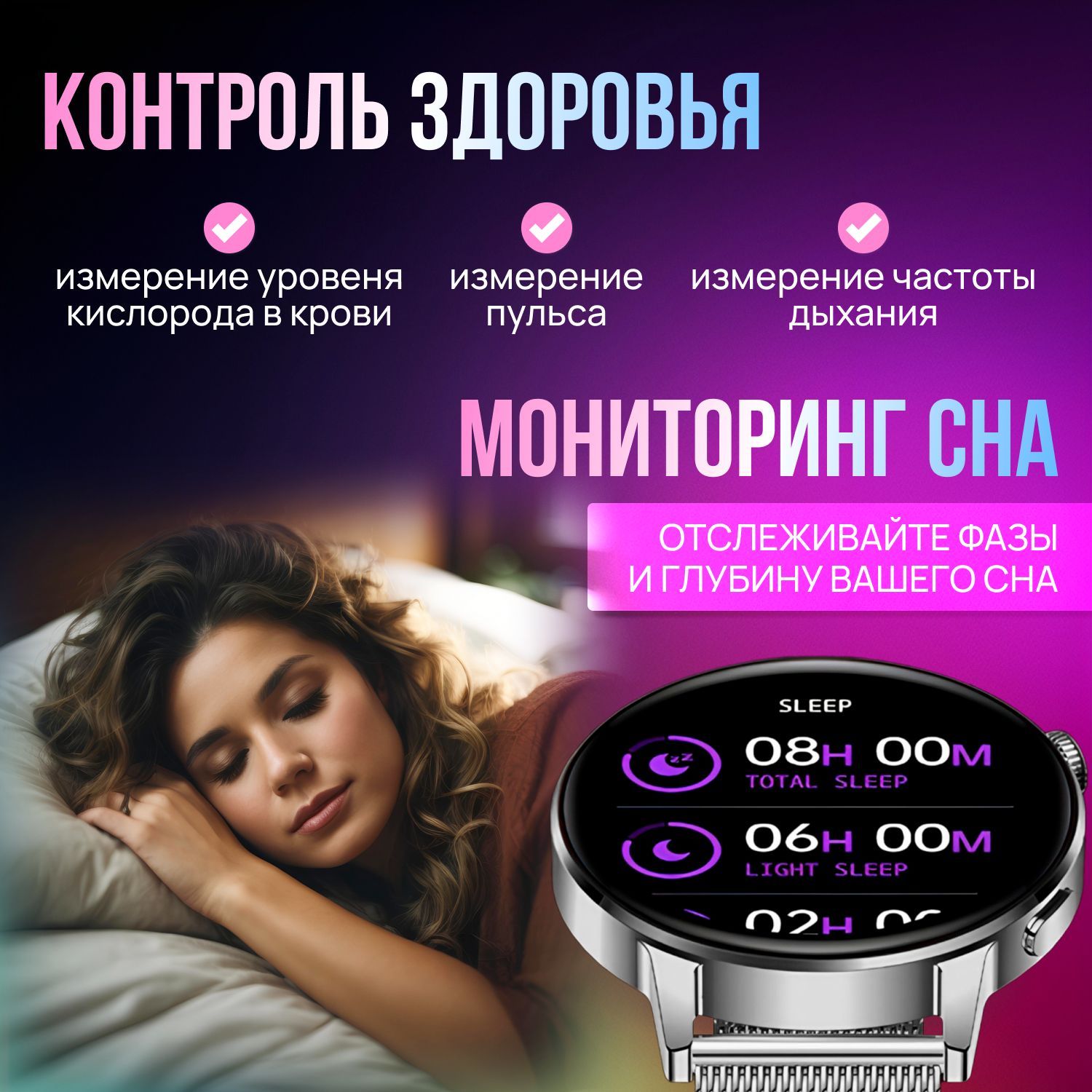Мониторинг: Сердечного ритма, Сна, Усвоения калорий, Физической активности