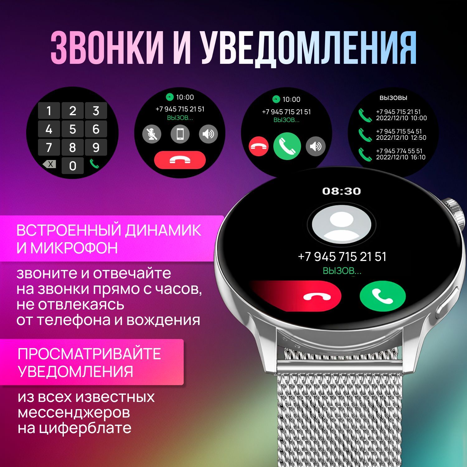 Не пропускайте звонки и уведомления! Будьте всегда на связи!Вы можете звонить и отвечать на звонки прямо со смарт-часов, благодаря встроенному микрофону и динамику. Для этого синхронизируйте часы с телефоном по Bluetooth и будьте всегда на связи.