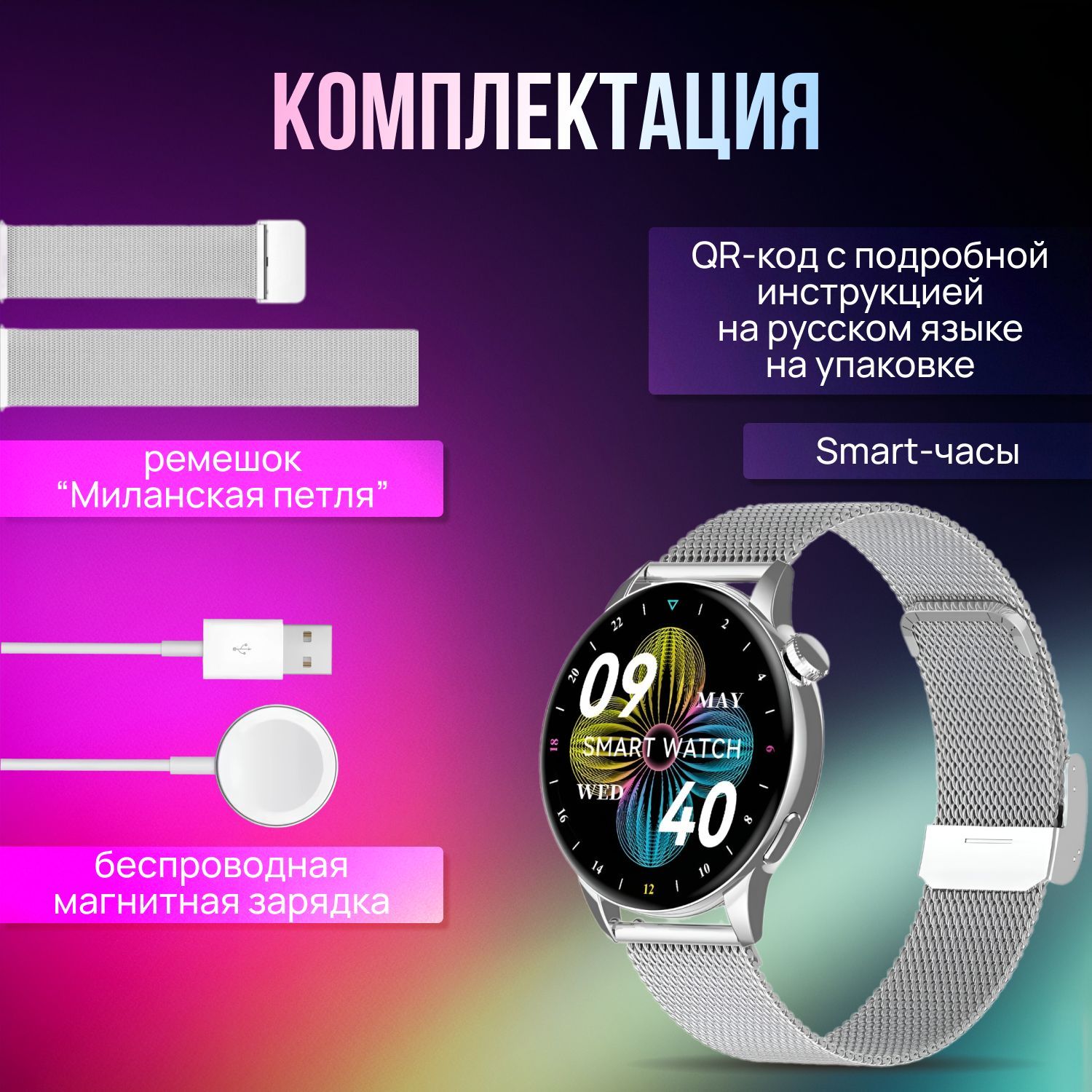 Смарт-часы G3 Pro - 1 шт. Ремешок "миланская петля" - 1 шт. Беспроводная магнитная зарядка - 1 шт. Инструкция - 1 шт. Коробка - 1 шт.