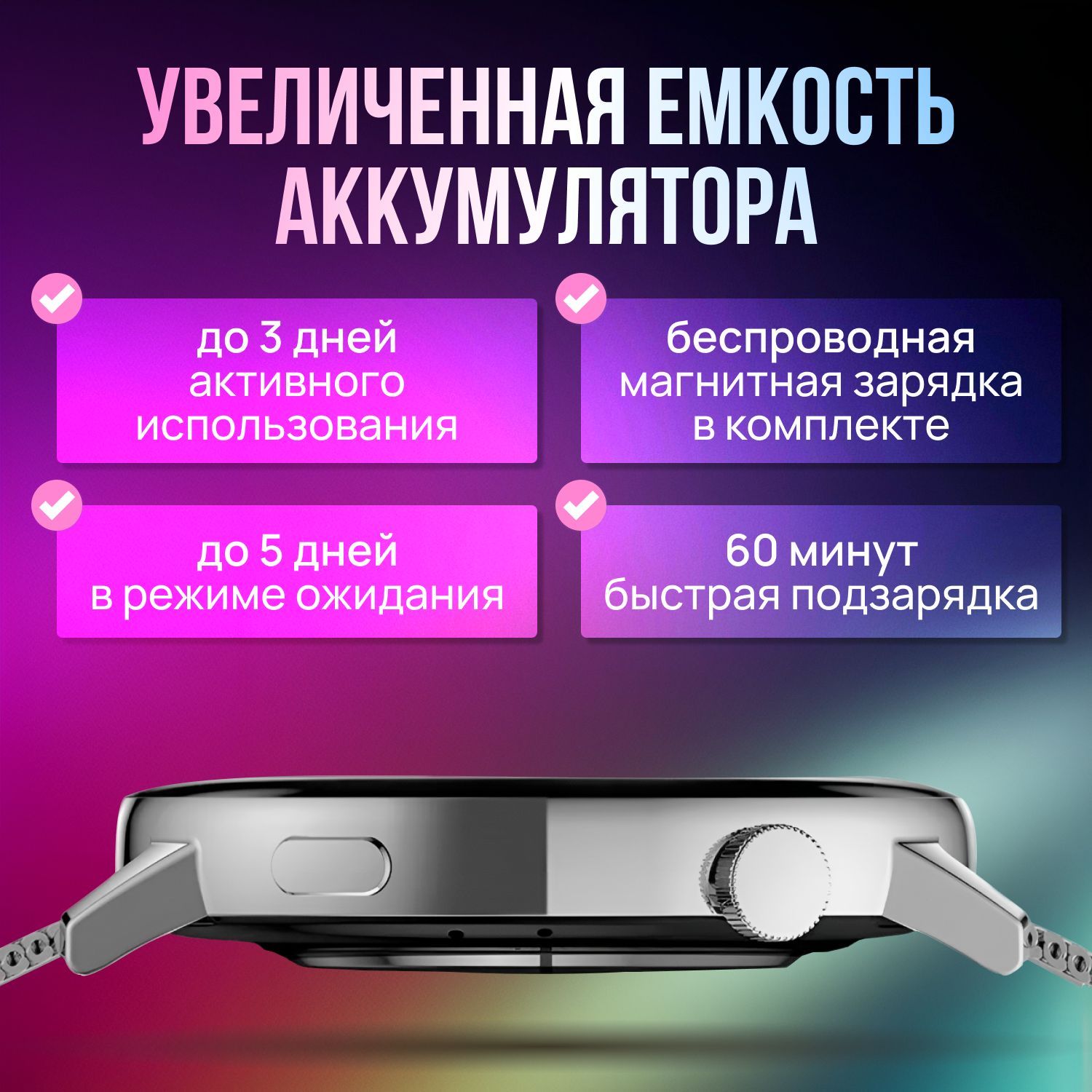 Быстро заряжается, долго держит зарядЧасы электронные наручные оснащены аккумулятором с большой емкостью в 300 мАч и с низким уровнем энергозатрат. Часы без подзарядки работают до 3 дней активного использования всех функций. Быстрая зарядка за 60 минут восстановит полный заряд фитнес браслета.Незаменимы в повседневностиИспользуйте гаджет на полную. Много функций облегчают повседневный быт.Удобное приложениеУстановите на свой смартфон приложение WearfitPro и синхронизируйте его с часами. Получите доступ ко всем функциям часов, отслеживайте свои показатели, меняйте настройки.