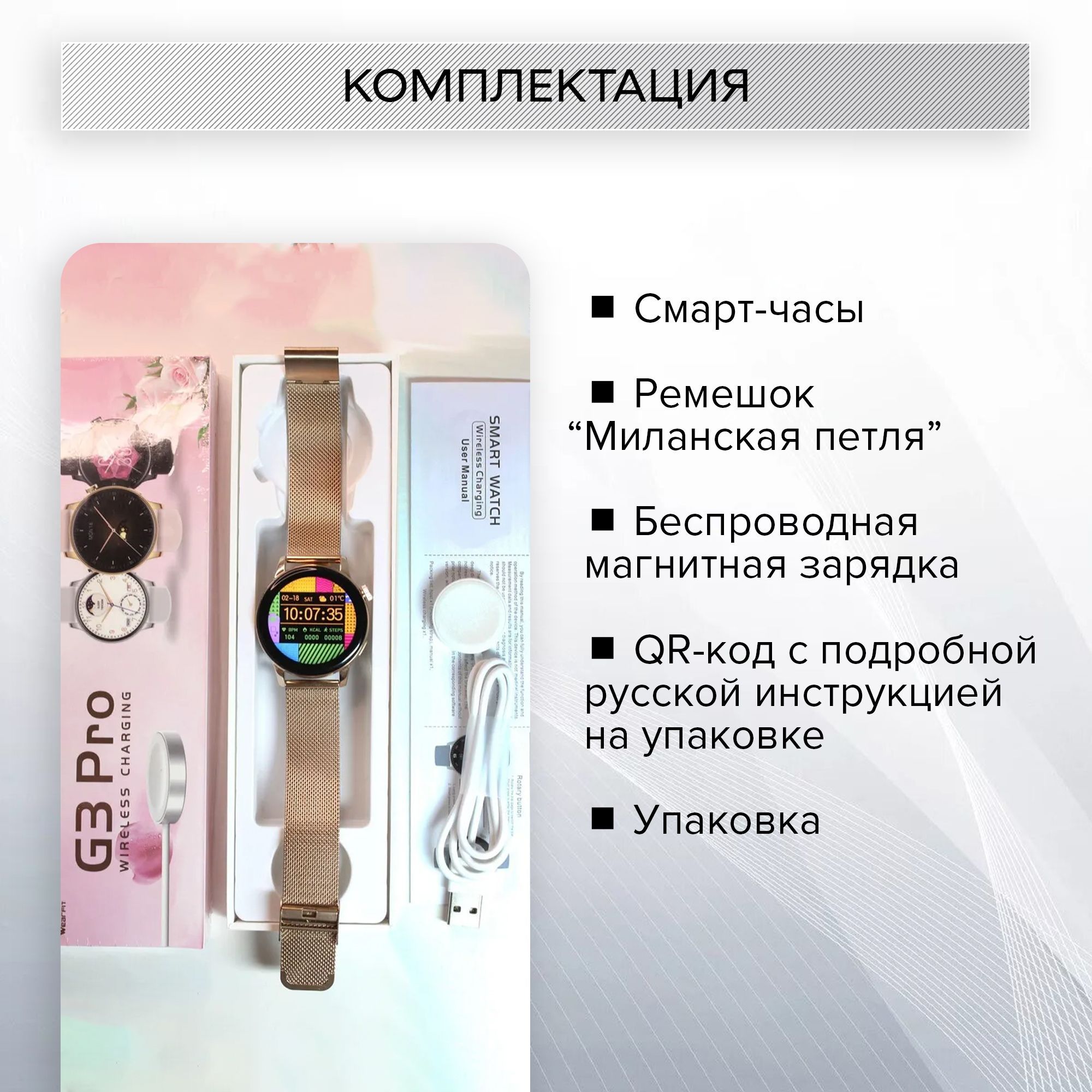 Смарт-часы G3 Pro - 1 шт. Ремешок "миланская петля" - 1 шт. Беспроводная магнитная зарядка - 1 шт. Инструкция - 1 шт. Коробка - 1 шт.