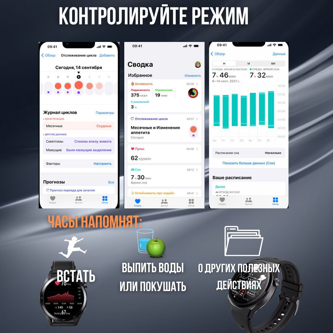 Описание: Чувствительные датчики измеряют ваш пульс, давление, уровень кислорода в крови, а также отслеживают длительность и глубину сна.
