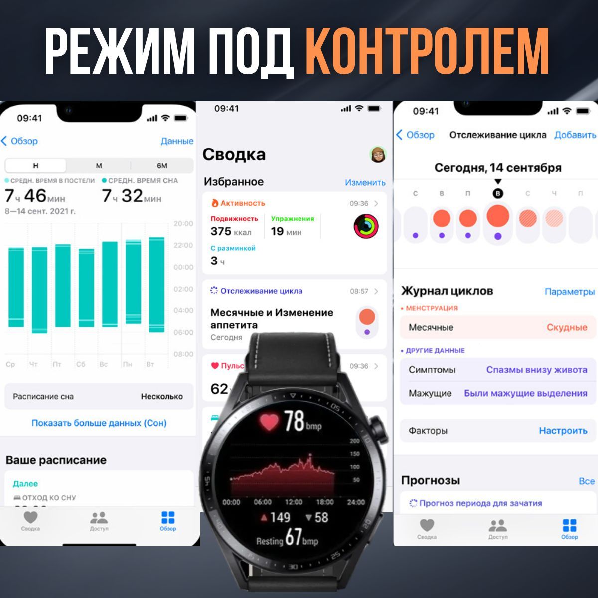 Мониторинг: Сердечного ритма, Сна, Усвоения калорий, Физической активности