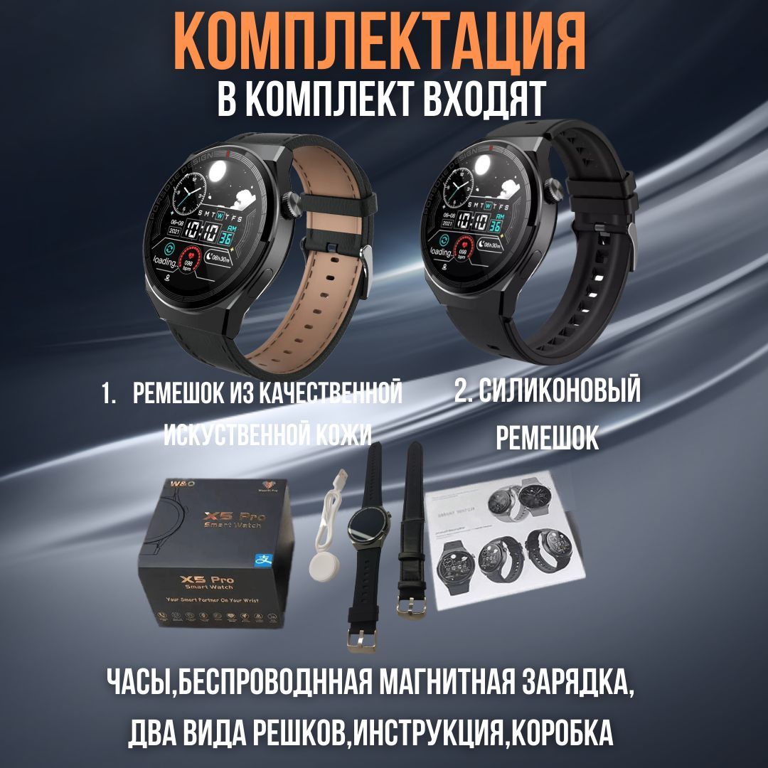 Смарт часы Smart Watch X5 Pro мужские с 2 ремешками / наручные / круглые/ с gps, телефоном / фитнес браслет / шагомер / электронные / умные часы с сенсорным экраном / 46mm /смарт вотч 5 / счетчик калорий / Bluetooth/спортивные / черные