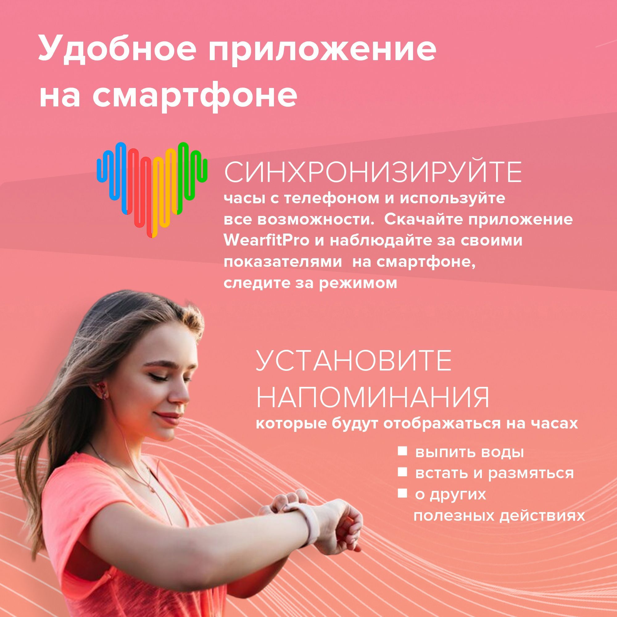 МногофункциональностьИспользуйте гаджет на полную. Много функций облегчают повседневный быт.Мониторинг снаПредусмотрена функция мониторинга сна. Используйте умный браслет на полную. Записывайте и анализируйте свой ежедневный глубокий сон, легкий сон, бодрствование и другие различные состоянияУдобное приложениеУстановите на свой смартфон приложение WearfitPro и синхронизируйте его с часами. Получите доступ ко всем функциям часов, отслеживайте свои показатели, меняйте настройки.