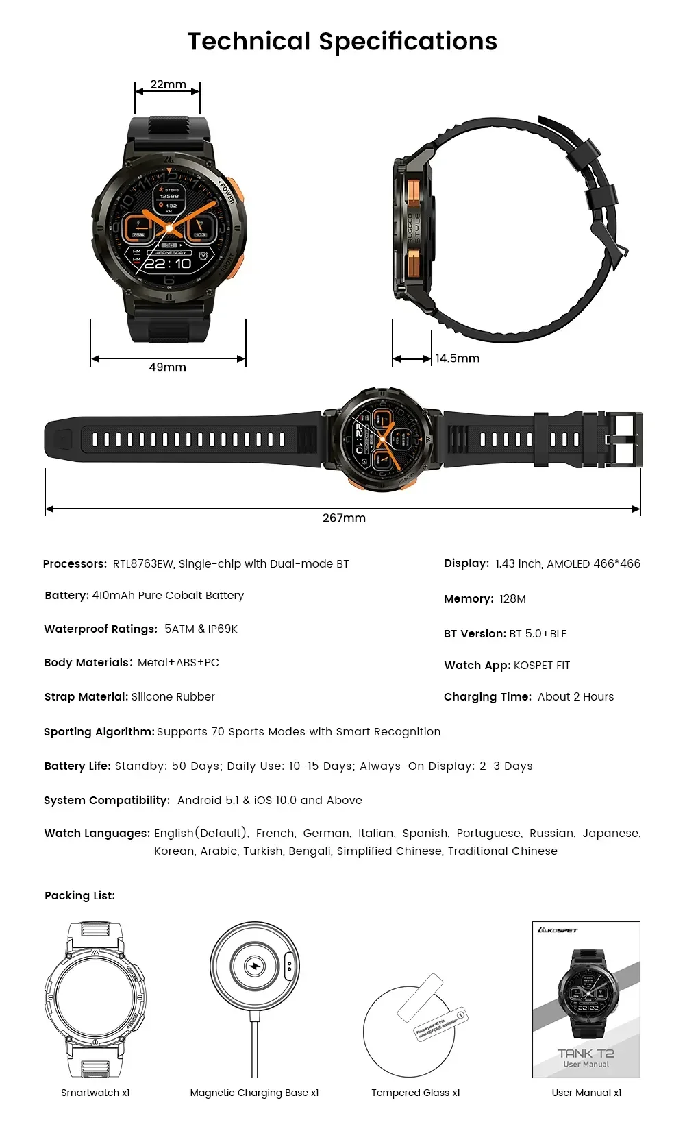 【Многофункциональный смарт-часы】 KOSPET TANK T2