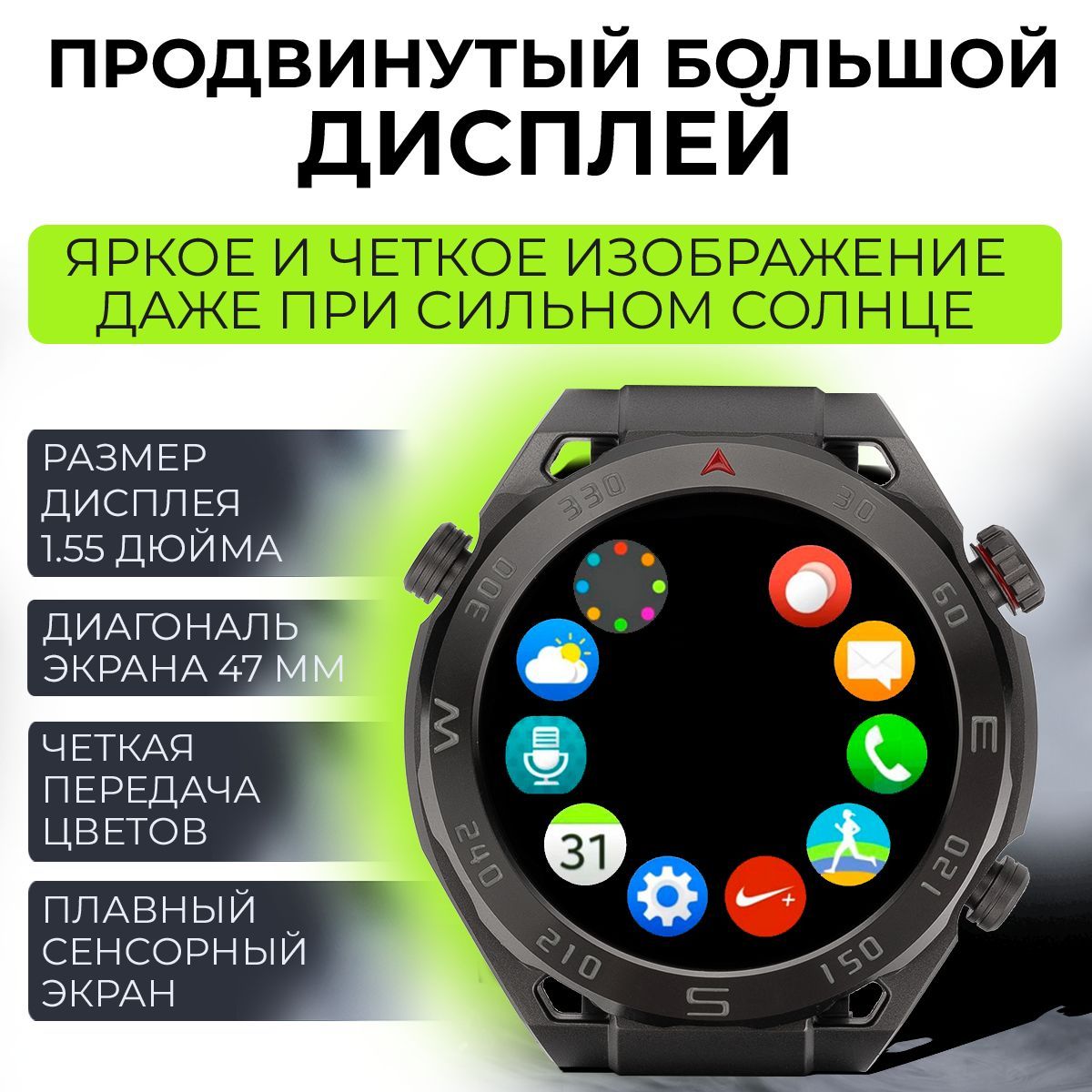 Диагональ дисплея 47mm.