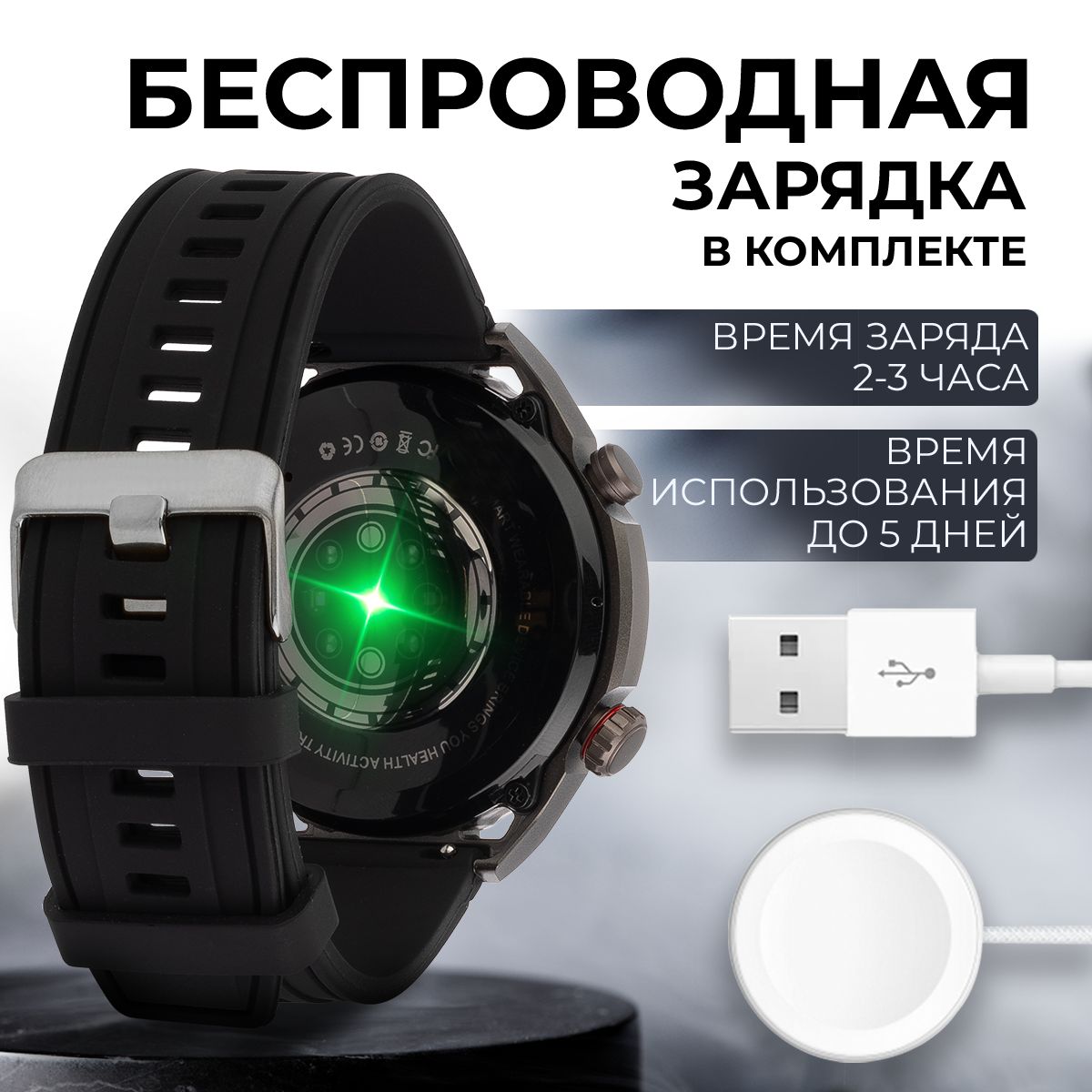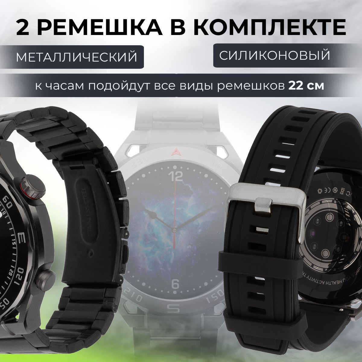 Смарт часы 1 шт. Силиконовый ремешок 1 шт. Стальной ремешок 1 шт. Беспроводное зарядное устройство для часов 1 шт. Руководство пользователя 1 шт.