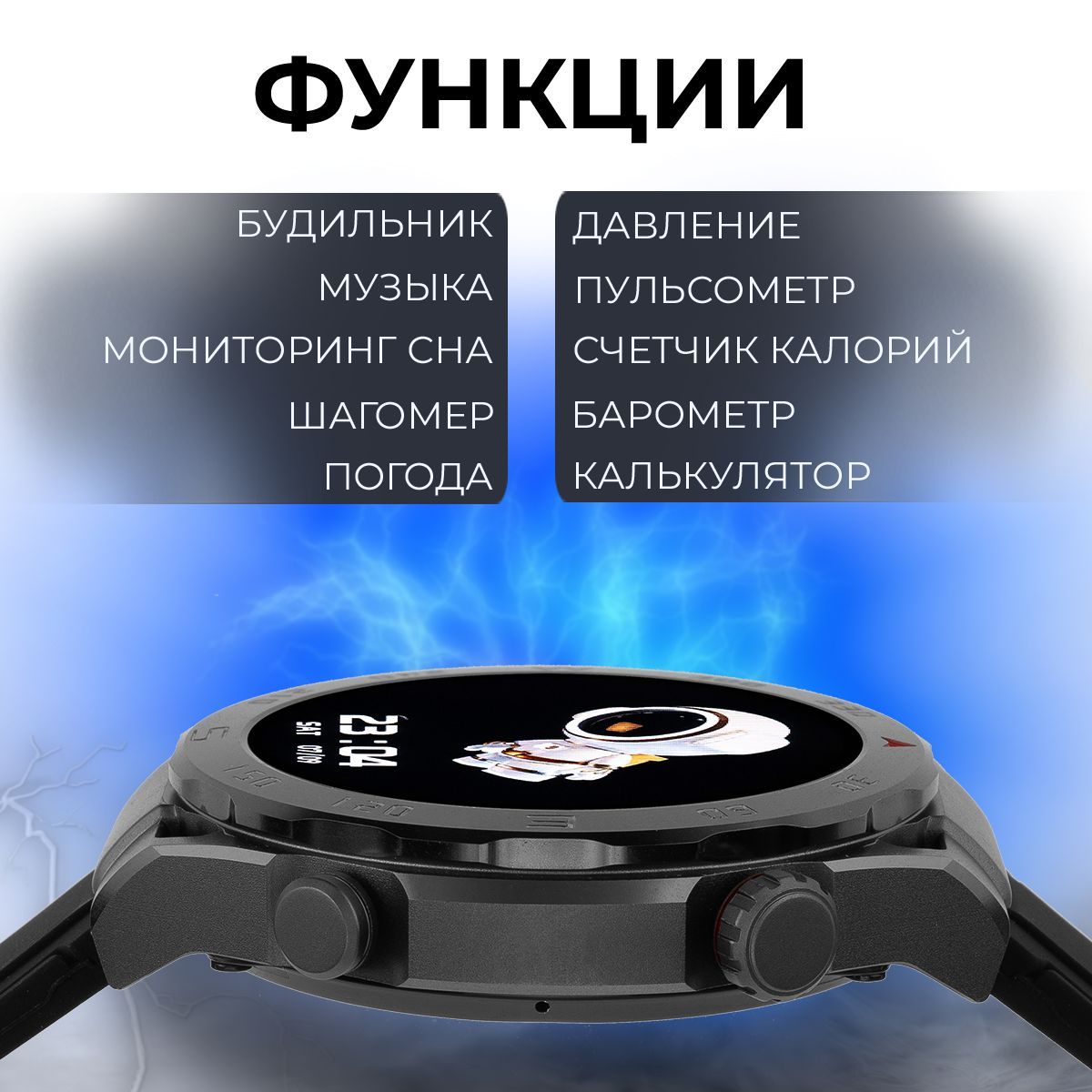 Встроенные датчики: Гироскоп, Датчик артериального давления, Датчик движения, Компас, Пульсометр, Датчик уровня кислорода в крови, Счетчик калорий, Шагомер, Барометр