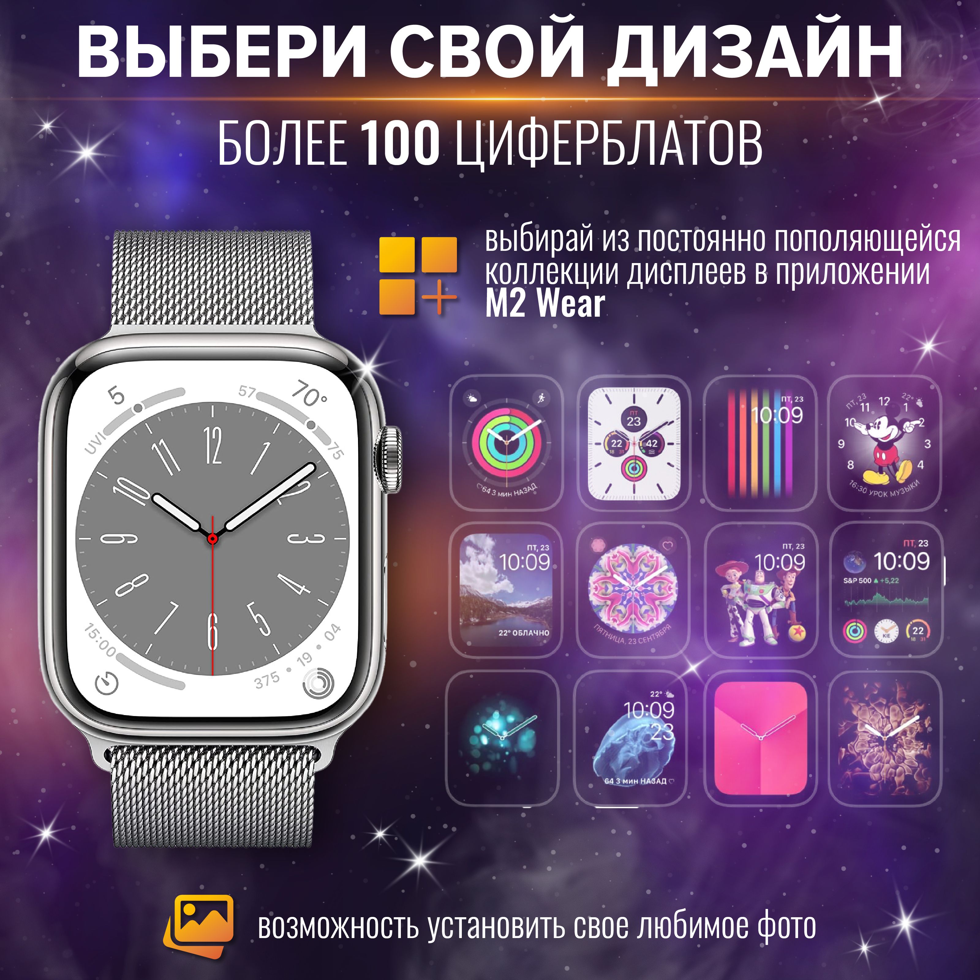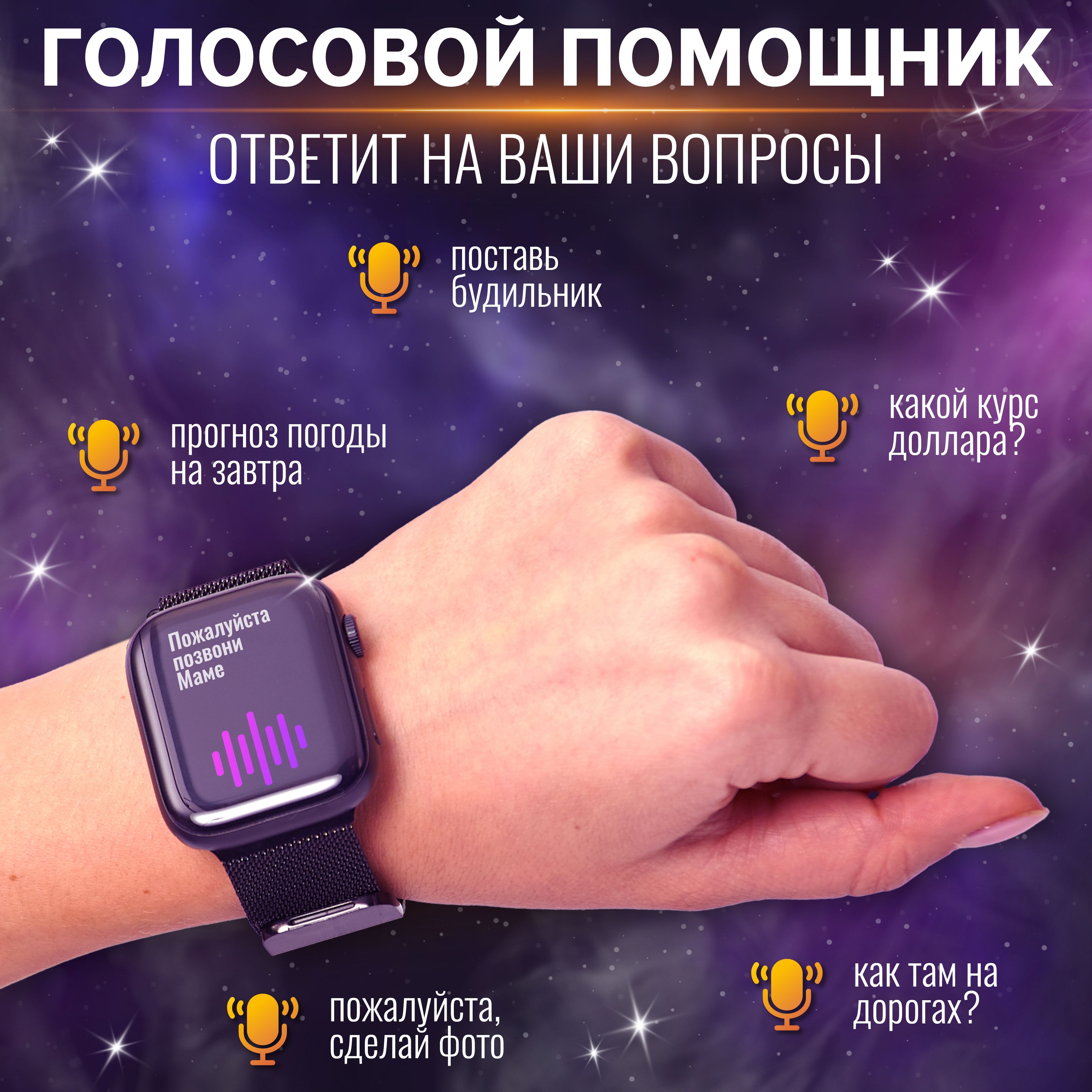Смарт часы - 1шт. Силиконовый гипоаллергенный ремешок - 1шт. Беспроводная зарядка - 1шт. Инструкция - 1шт. Второй браслет из нержавеющей стали в подарок (Миланская петля) - 1шт.