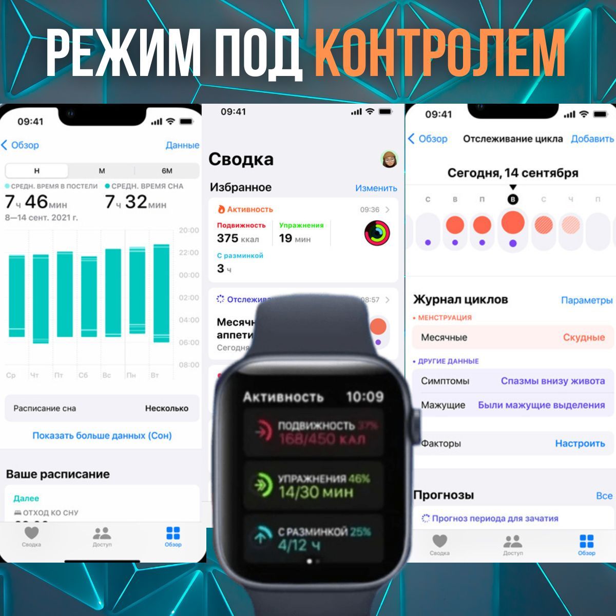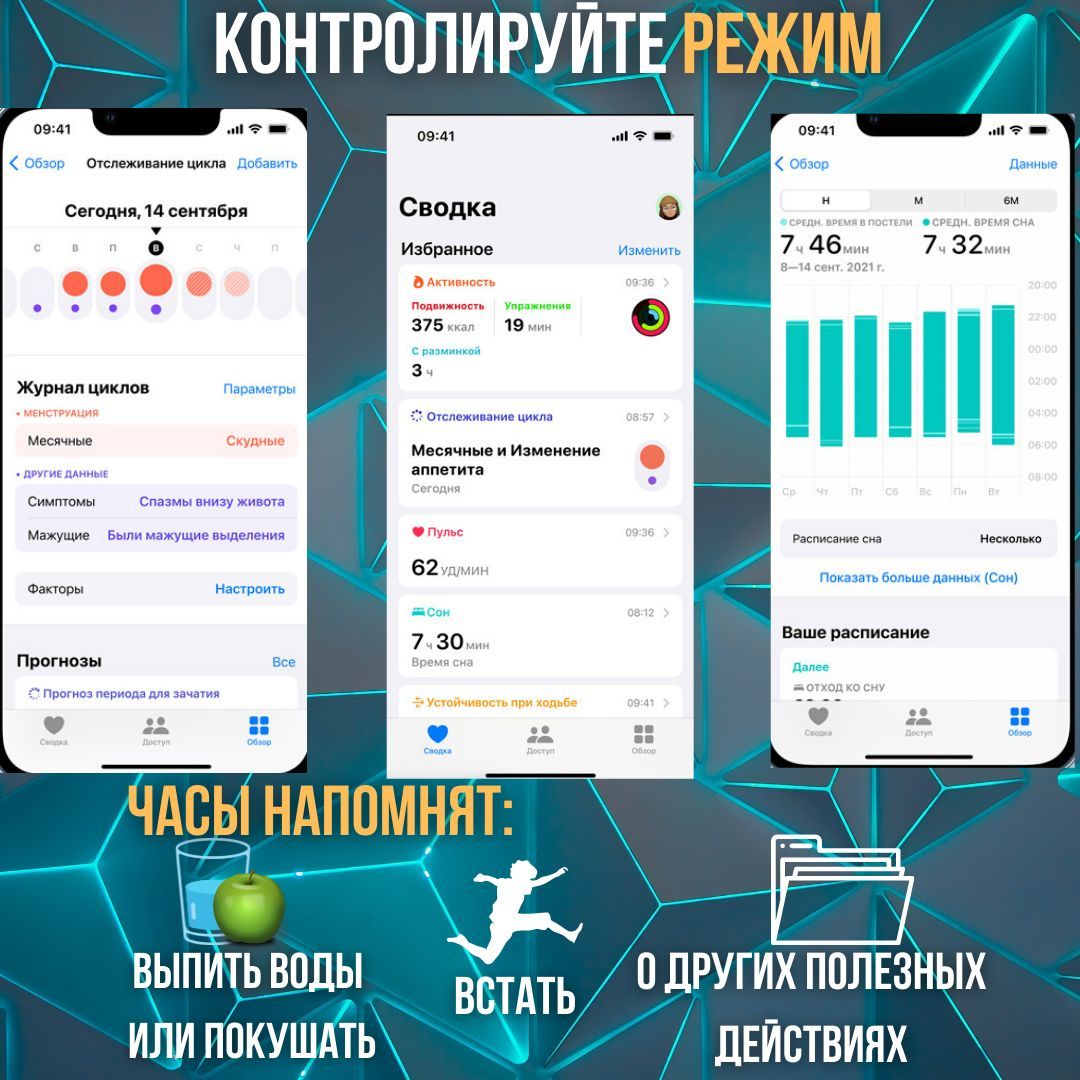 Мониторинг: Сердечного ритма, Уровня стресса, Сна, Усвоения калорий, Физической активности