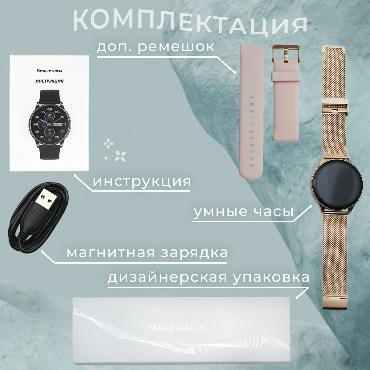 Смарт-часы - 1 шт. Запасной металлический ремешок - 1 шт. USB кабель (зарядка) - 1 шт. Инструкция на русском языке - 1 шт