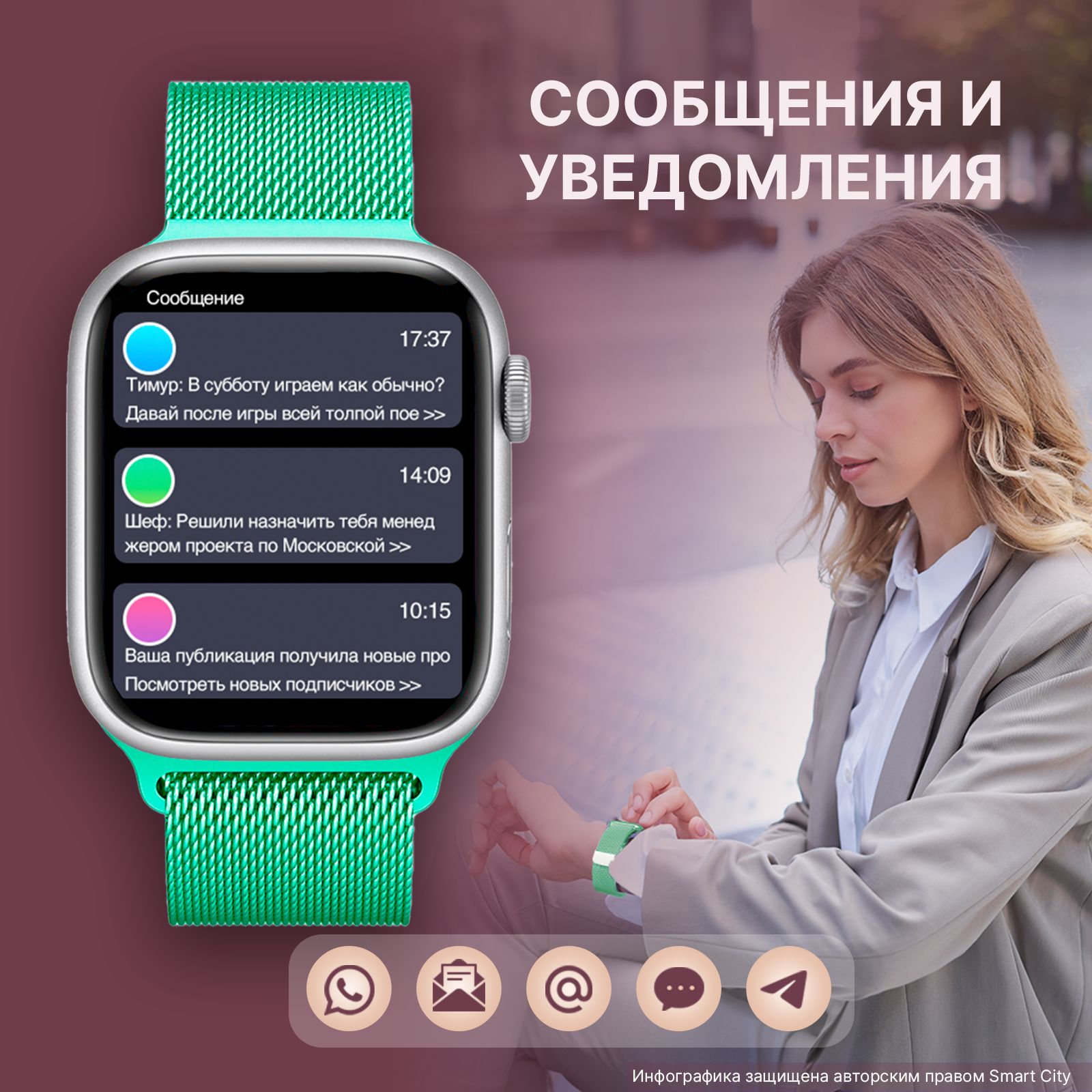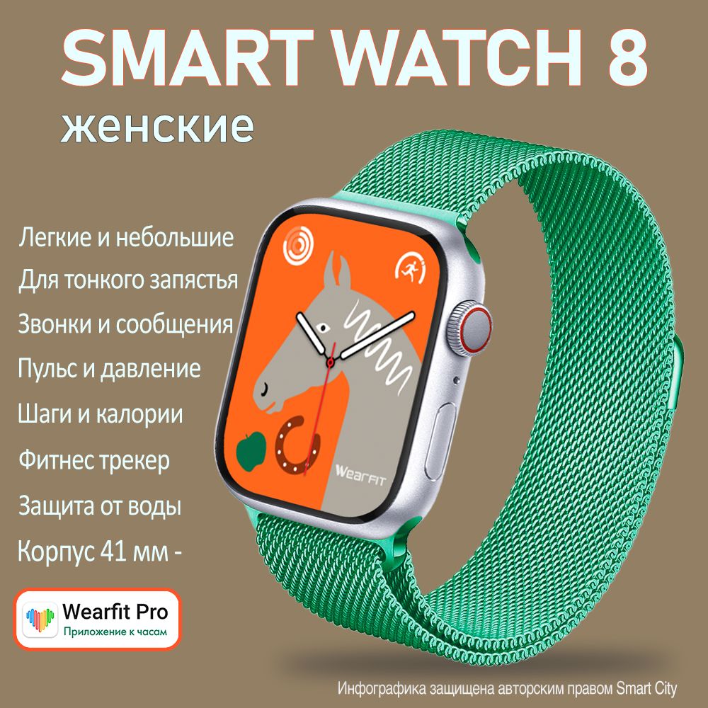 Смарт часы женские Smart Watch 8 Металлик с мятой 41 мм / Звонки - сообщения - тренировки / Умные часы на узкое запястье / Часы смарт для Android и IOS / Измеряют шаги, калории, пульс, давление