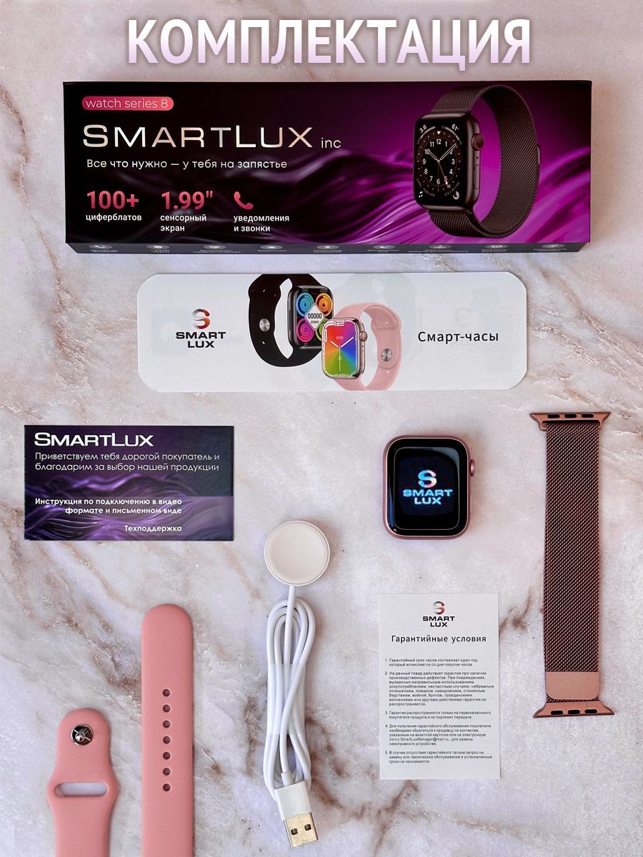 Смарт часы - 1шт. Силиконовый гипоаллергенный ремешок - 1шт. Беспроводная зарядка - 1шт. Инструкция - 1шт. Второй браслет из нержавеющей стали в подарок(Миланская петля) - 1шт.