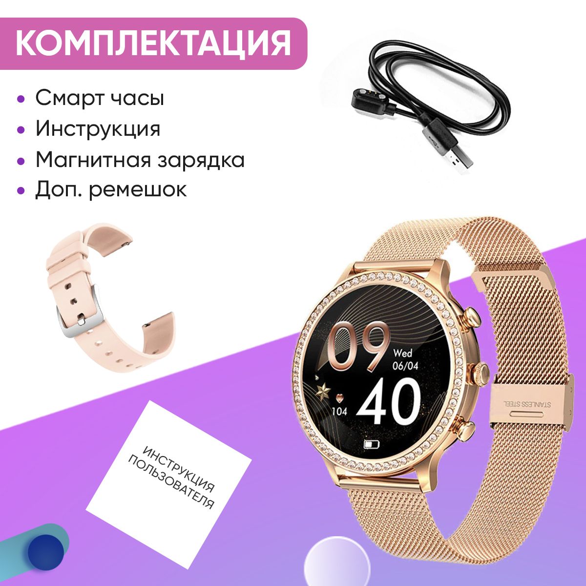 Смарт-часы - 1шт; Магнитное зарядное устройство - 1шт; Дополнительный силиконовый ремешок; Инструкция по эксплуатации - 1шт; Коробка упаковка - 1шт.