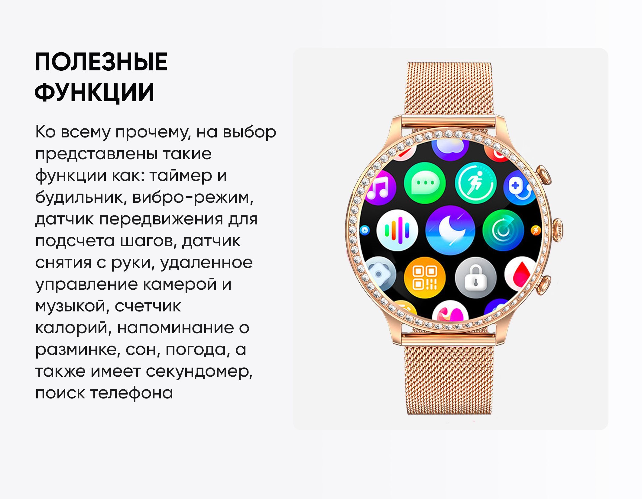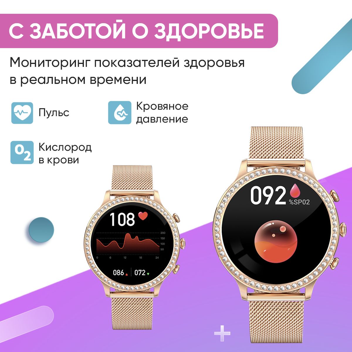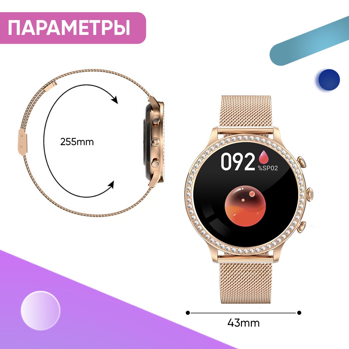 Встроенные датчики: Акселерометр, Датчик артериального давления, Датчик уровня кислорода в крови, Пульсометр, Счетчик калорий, Тонометр, Шагомер, Датчик движения