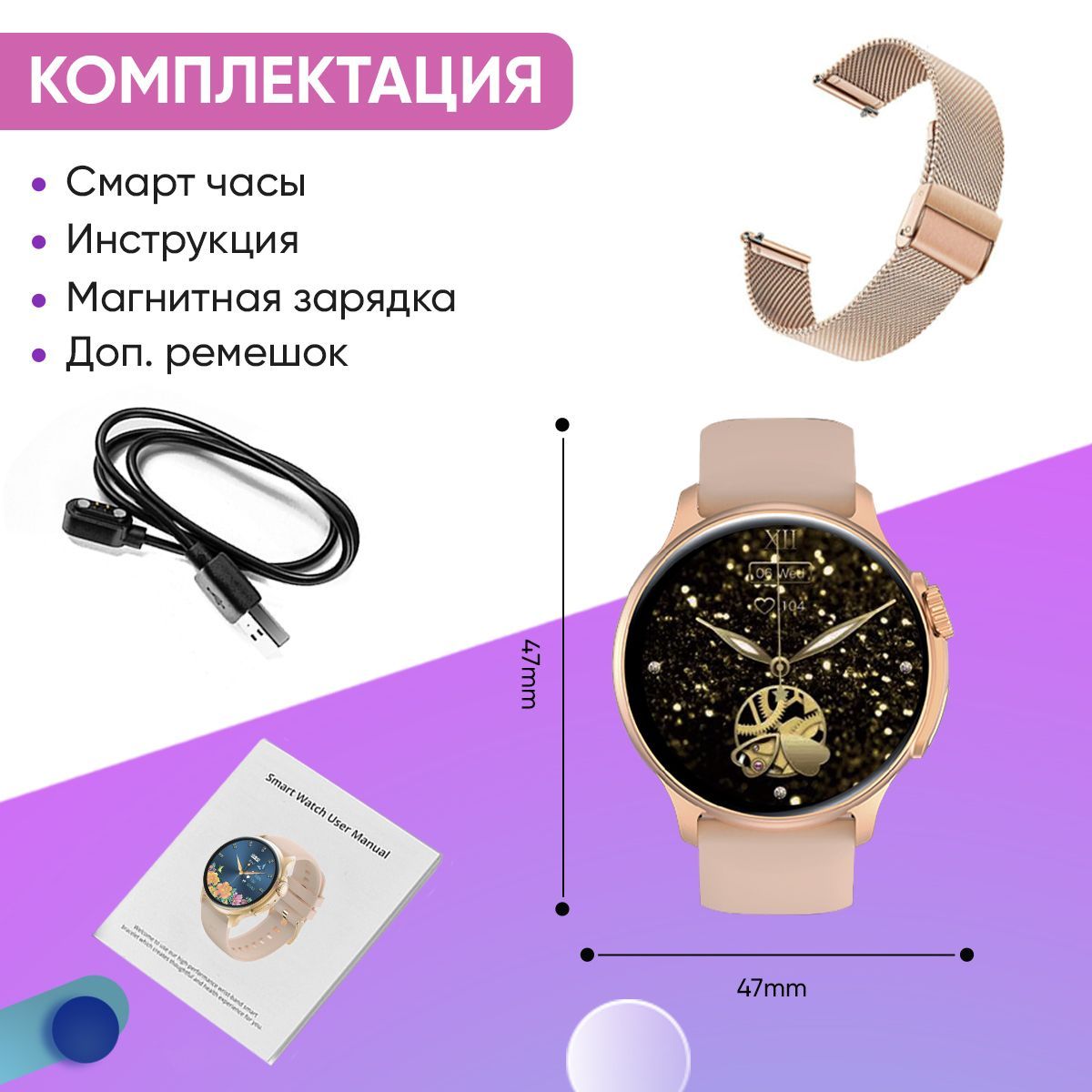 Смарт-часы - 1шт; Магнитная зарядка - 1шт; Инструкция по эксплуатации - 1шт; Дополнительный ремешок - 1 шт; Коробка упаковка - 1шт.