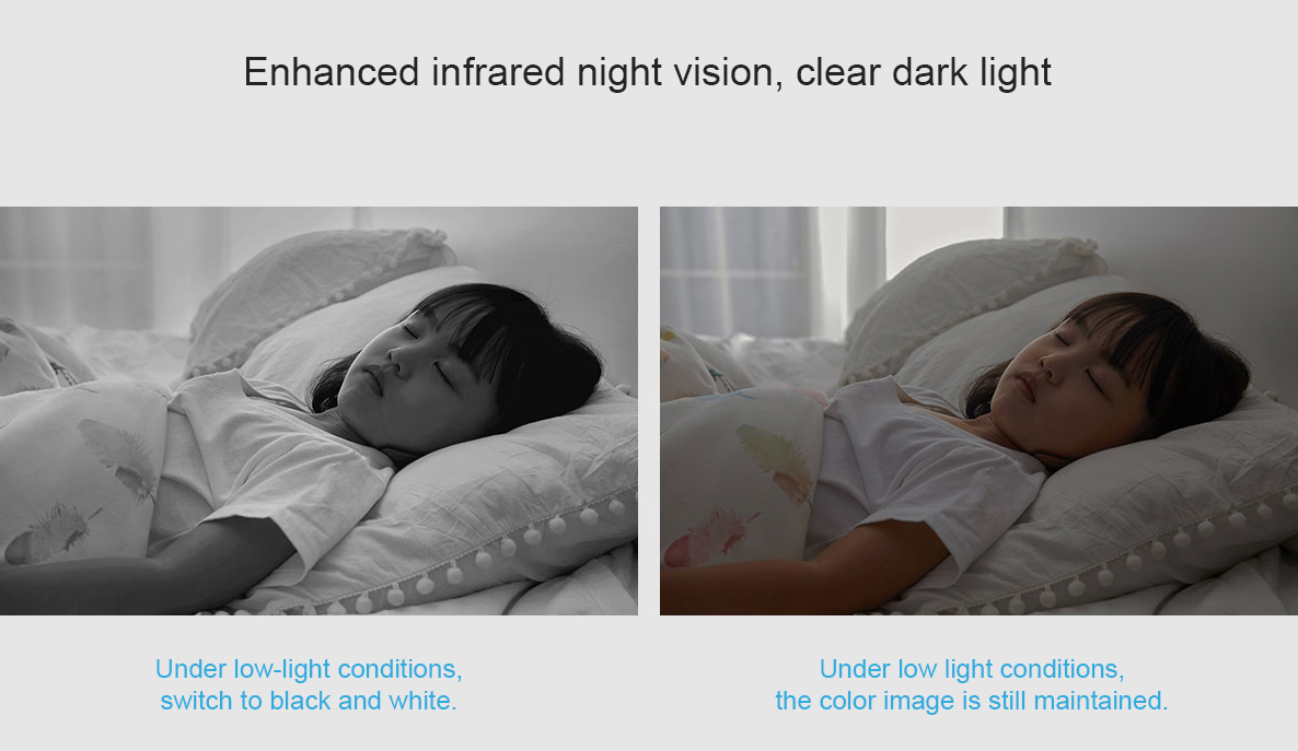 Встроенный инфракрасный заполняющий свет 940 нм, отсутствие Красной экспозиции ночью, что дает членам семьи возможность спать; с высокочувствительным датчиком изображения он также представляет цветные изображения в условиях низкой освещенности.