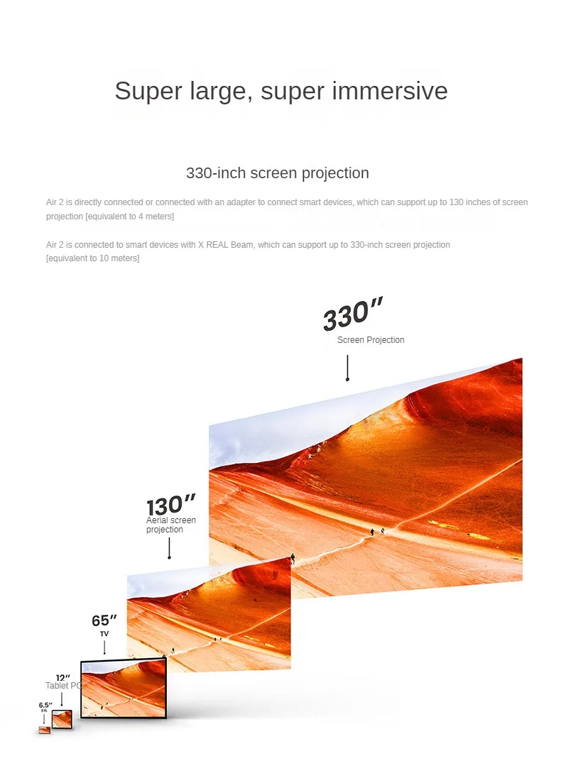 • Экран 330 дюймов в кармане, и больше не будет боли в шее или спине при взгляде вниз на экраны телефона/ноутбука. Лучшая альтернатива телевизору/проектору/монитору. Комфорт для глаз, низкий уровень синего света и точность цвета, сертифицированный TÜV Rheinland.