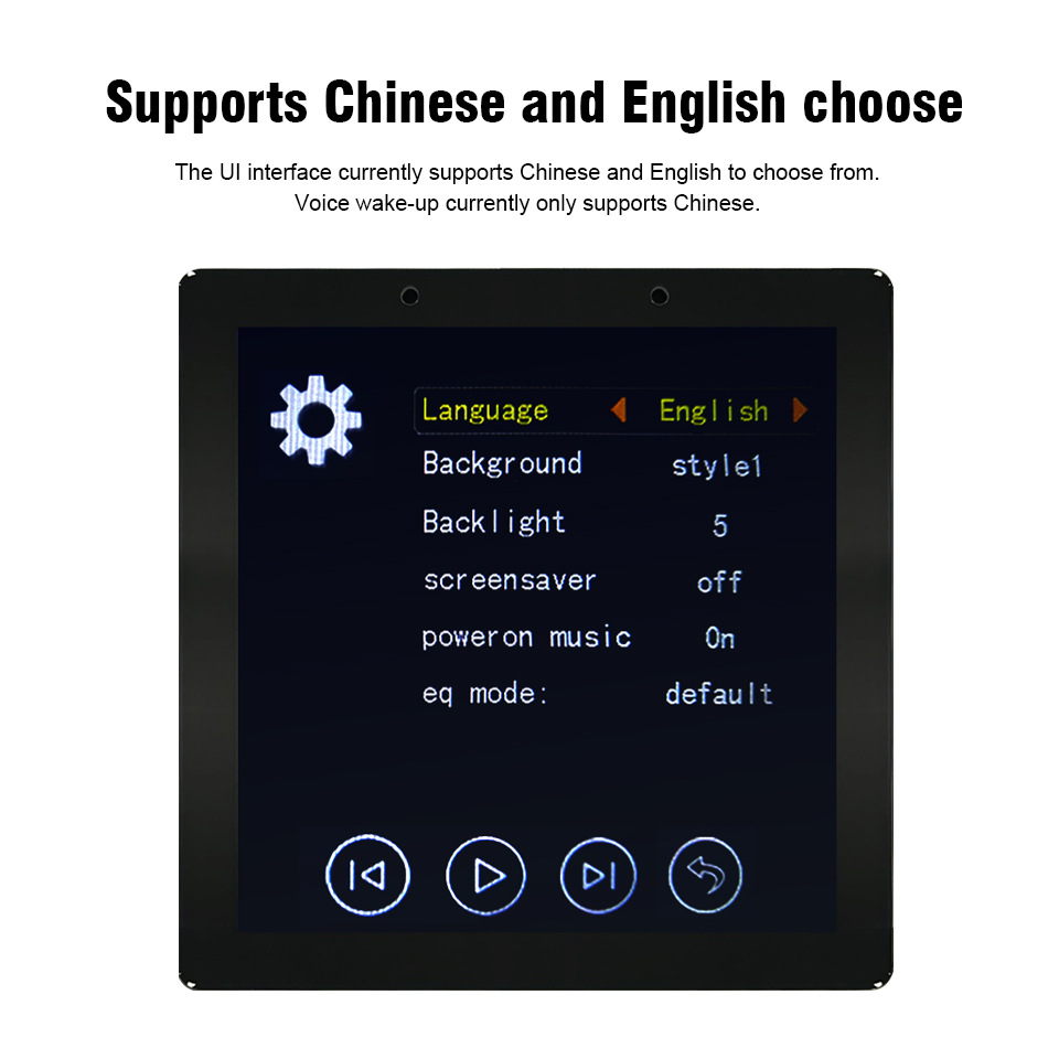 Этот продукт является нашим последним новым продуктом на рынке. Интерфейс пользовательского интерфейса в настоящее время поддерживает китайский и английский языки на выбор. Голосовое Пробуждение в настоящее время поддерживает только китайский язык. В настоящее время обновляется и совершенствуется пакет данных на различных языках. Он может нормально работать на мобильном телефоне или на панели. Функция, другие функции в норме!