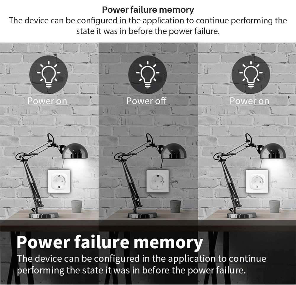 Устройство может быть настроено в приложении, чтобы продолжить выполнение состояния, в котором оно было до сбоя питания.
