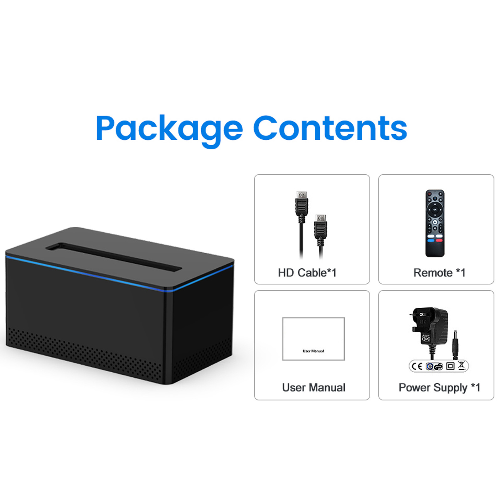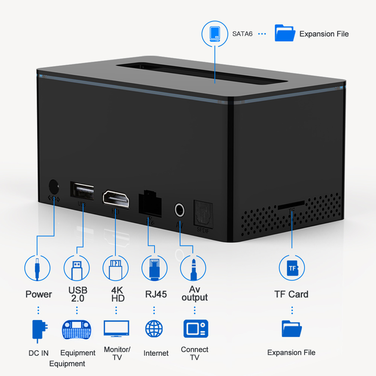 Интерфейсы ввода/вывода: 1 * Выход HD, 1 * Выход AV, 1 * USB 2,0, 1 * слот для карт TF, 1 * RJ45, 1 * вход постоянного тока, 1 * слот SATA6, 1 * SPDIF