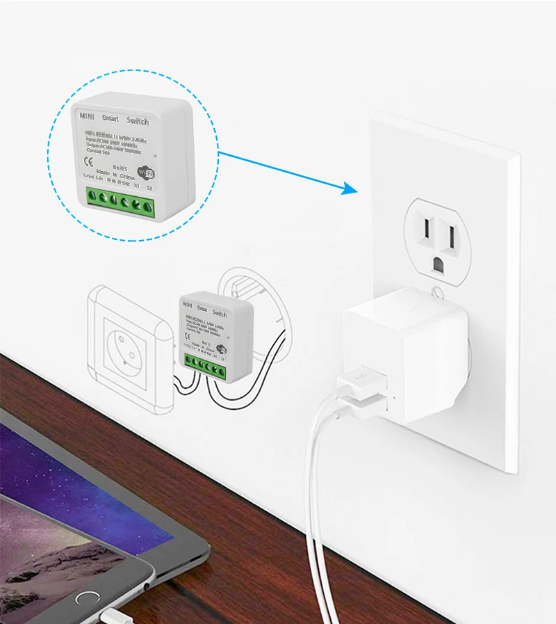 Например, переустановка настольной лампы в умную настольную лампу, и мобильный телефон может управлять переключателем светильник. Чтобы превратить светильник в умный светильник, вам нужно всего лишь подключить модуль smart switch к коммутатору, а затем Alexa/Google assistant может управлять переключателем светильник.