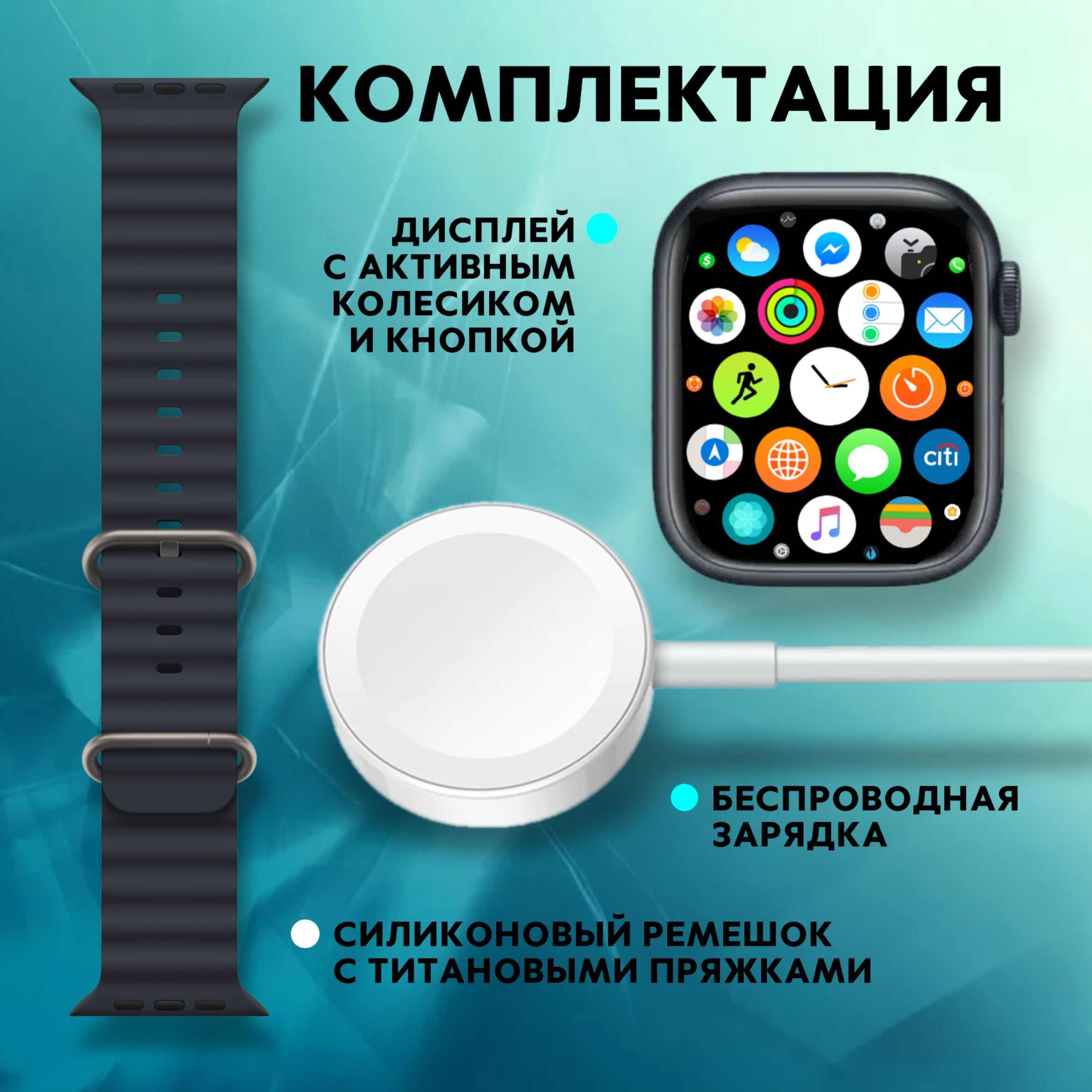 Смарт-часы; Съёмные силиконовые ремешки; Беспроводная зарядка; Красивая коробка; Инструкция