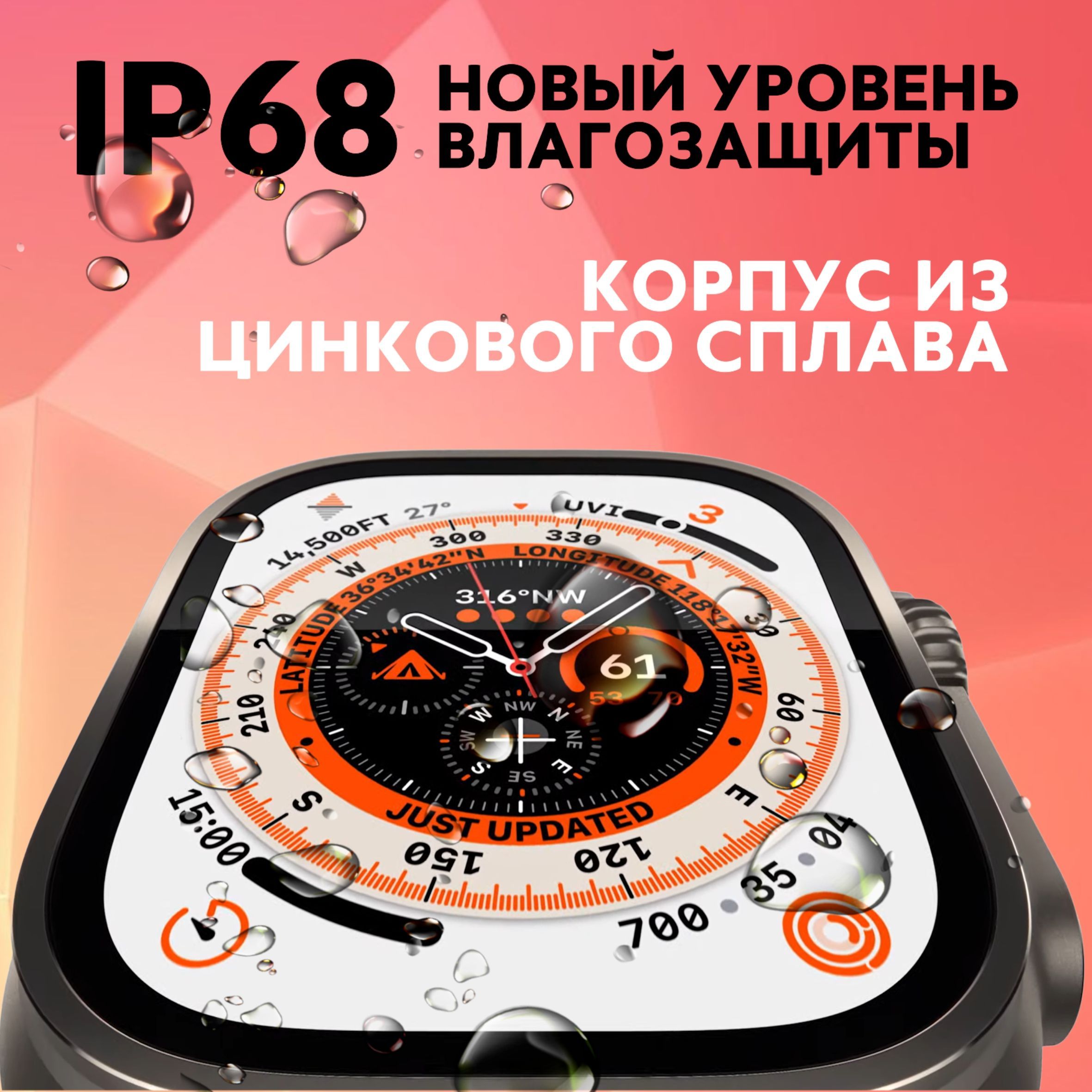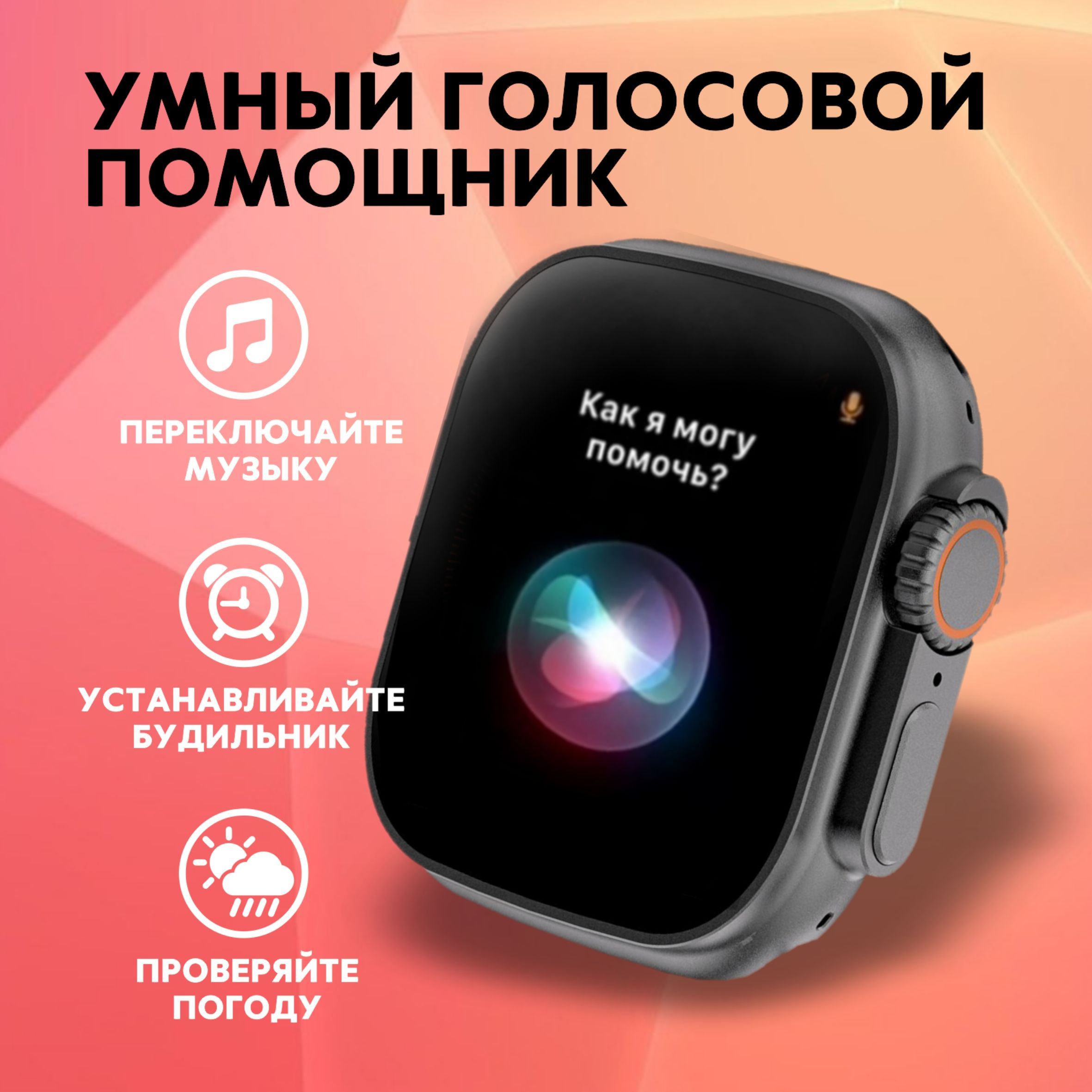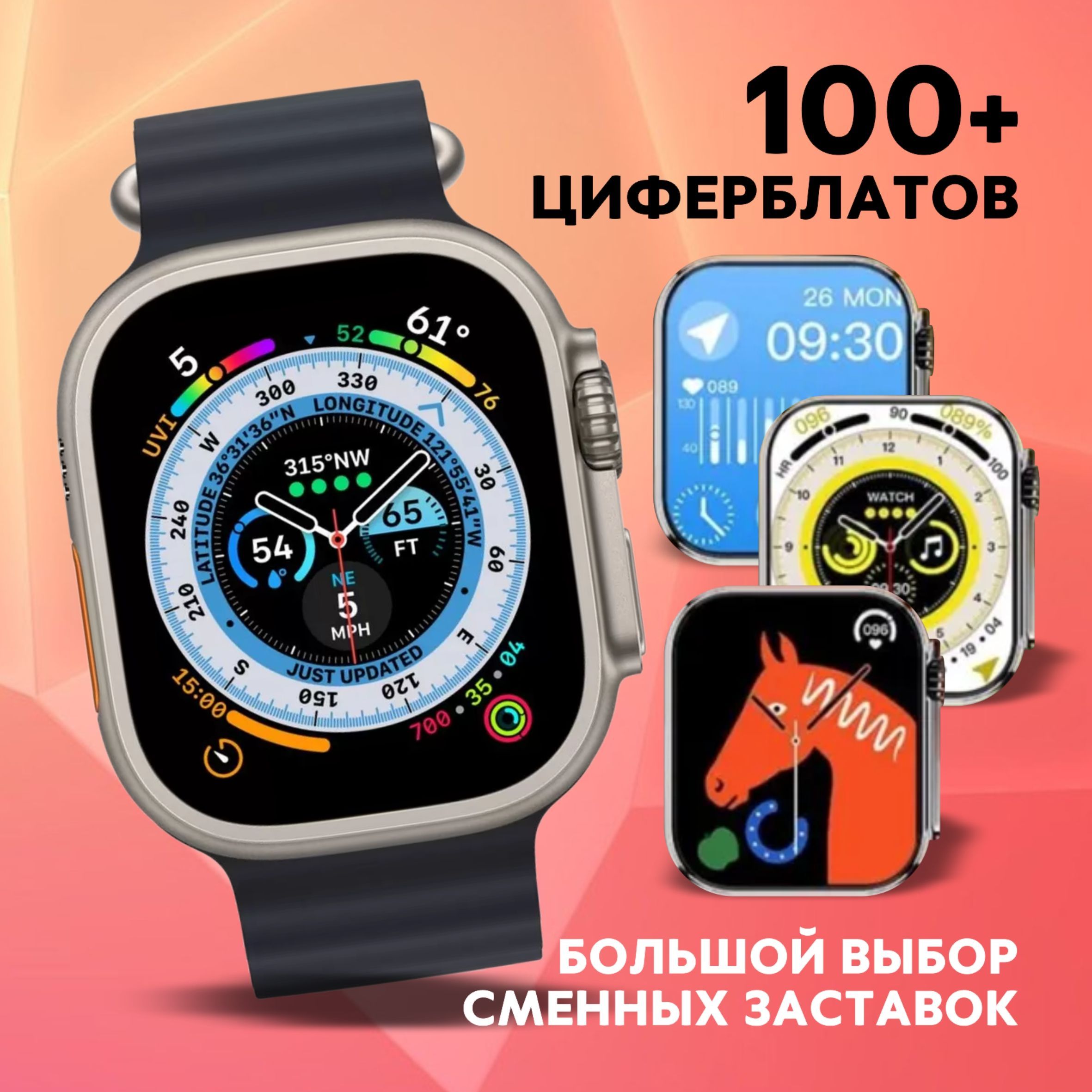 Описание: Smart Watch Series Ultra PREMIUM T900Надёжность, стиль, функциональность, удобствоСледи за здоровьемЧасы оснащены многочисленными датчиками, которые позволяют отслеживать здоровье как в повседневной жизни, так и во время занятий спортом. Вы спокойно можете использовать их во время тренировок.Управляй при помощи голосаСмарт часы имеют голосового помощника, который позволяет вам своей речью управлять ими и настраивать их. Настраивайте будильник, смотрите погоду или переключайте музыку!Все функции смартфона в часах!В наших смарт-часах есть калькулятор, будильник, таймер, GPS геолокатор, компас, камера, поэтому вы можете частично заменить телефон данными часами.Дизайн циферблата на ваш вкусМы собрали для вас огромное количество внешних видов циферблатов. Поэтому вы можете выбрать любой на свой вкус и наслаждаться его внешним видом каждый день!Не упустите ни одного сообщенияО всех сообщениях, приходящих на ваше устройство, привязанное к часам, вас уведомляют и сами смарт часы, поэтому даже самые важные сообщение не останутся неувиденными.Не бойтесь попадания водыСмарт часы защищены от влаги и пыли с помощью нового уровня влагозащиты IP68, поэтому они не сломаются, если на них попадёт влага или пыль. А сам корпус сделан непосредственно из цинкового сплаваВсё необходимое - в комплектеПри заказе вы получаете сами смарт часы, 2 съёмных ремешка, беспроводную зарядку, инструкцию по применению и саму коробку.