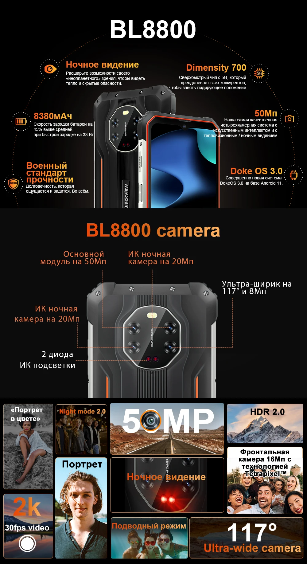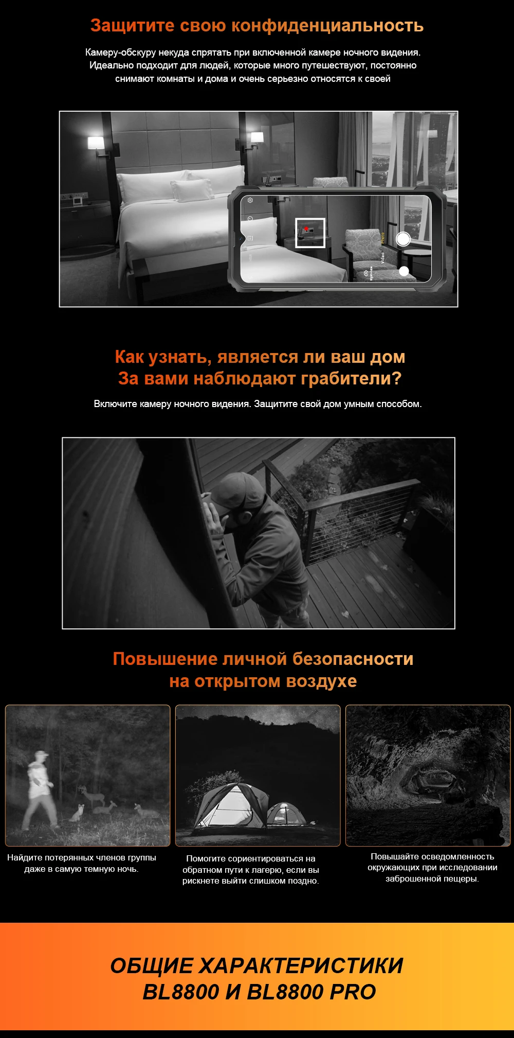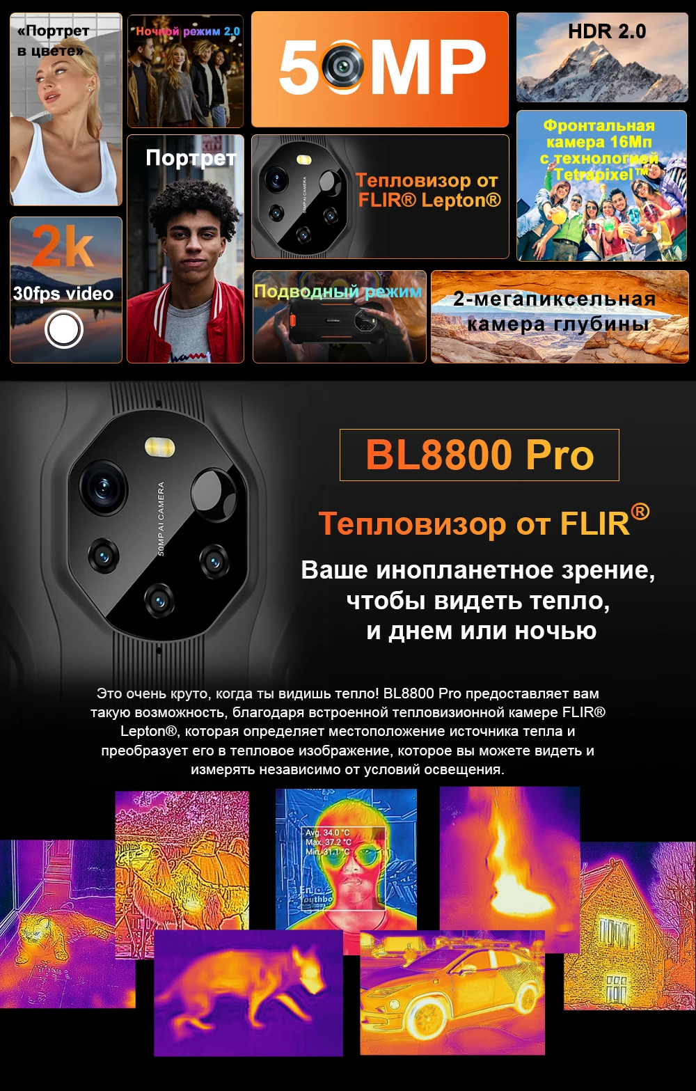 Примечание: разница между BL8800 и BL8800 Pro-это задняя камера. BL8800 Pro имеет FLIR®Лептон®Тепловизионная камера и Ультрапрозрачная Основная камера 50MP; BL8800 имеет ИК-камеру ночного видения 20MP, ультра-широкоугольный фотоаппарат 8MP 117 ° и основную камеру 50MP