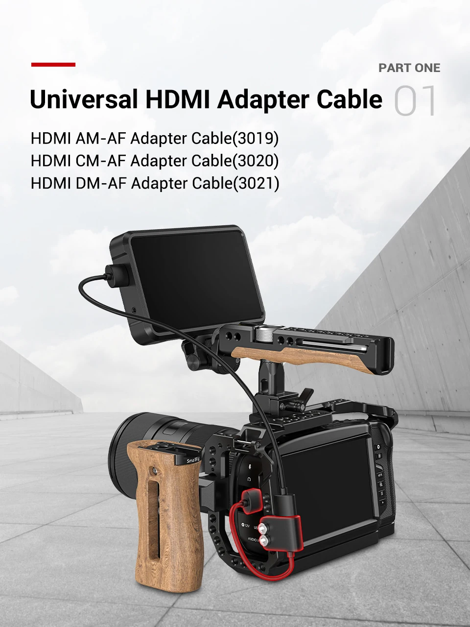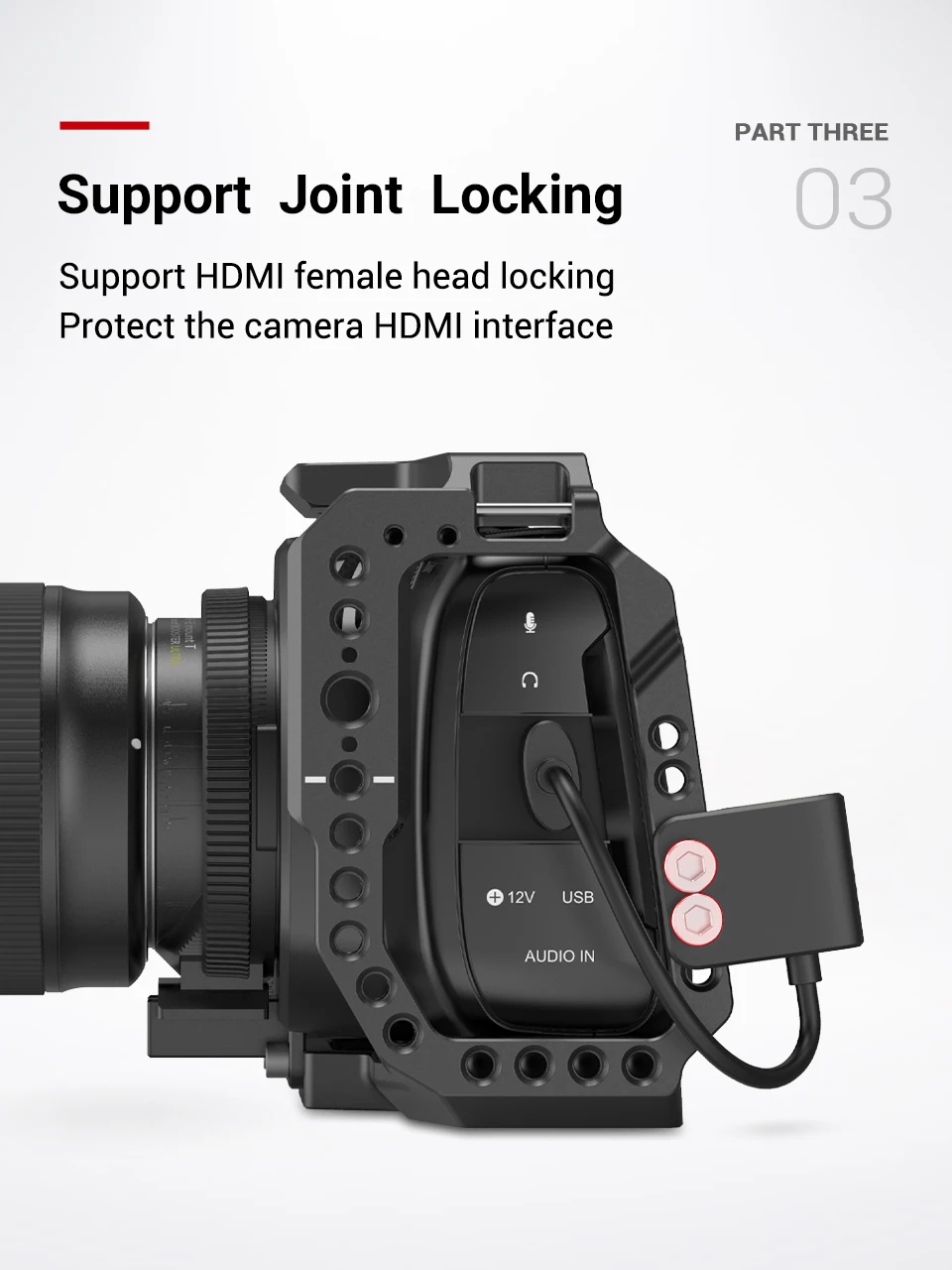 3. Он оснащен двумя винтами 1/4-20 ", чтобы зафиксировать женскую часть на боковой стороне камеры или l-кронштейна плотно, чтобы защитить порт HDMI камеры и обеспечить более стабильное соединение.