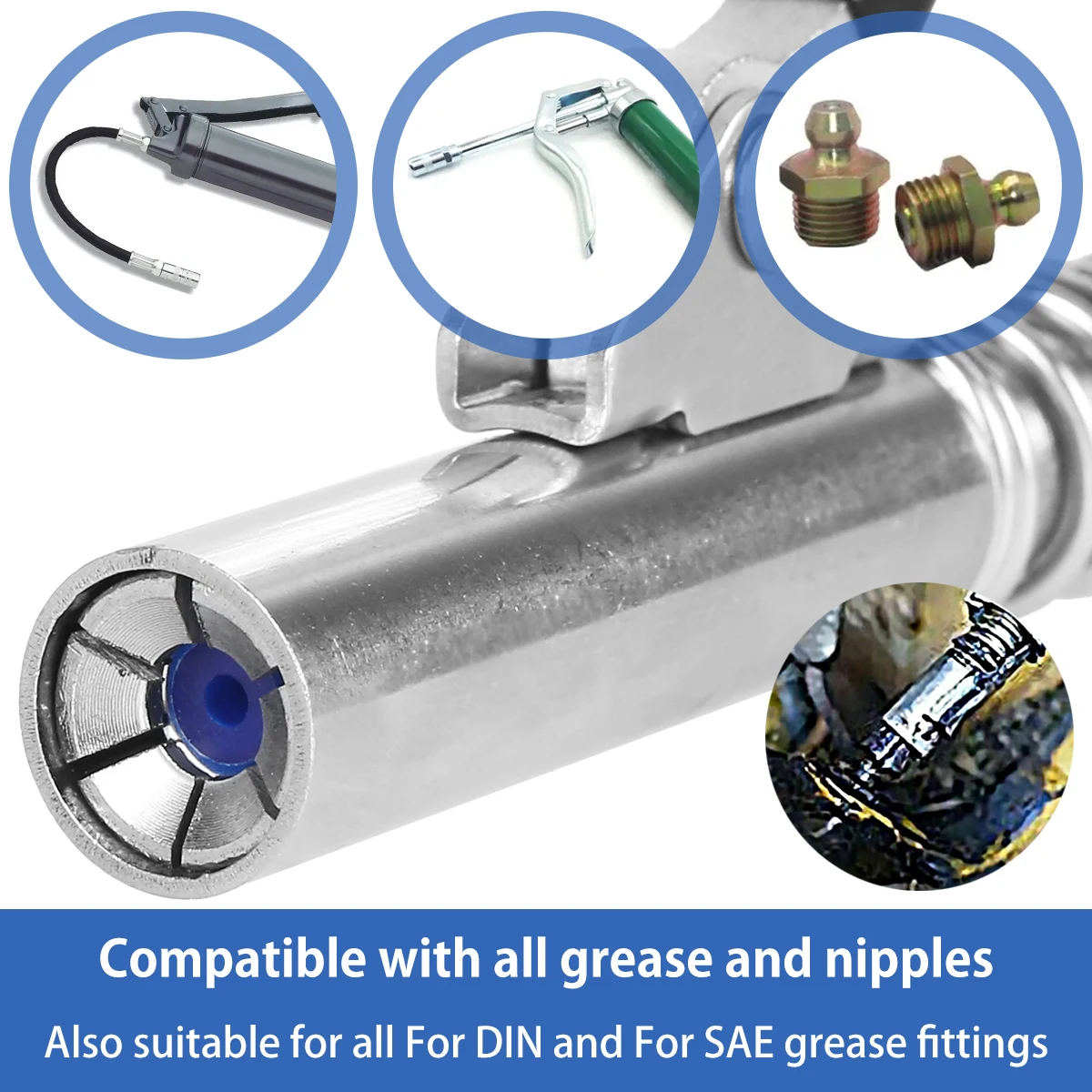 [Compatible with All Grease Tools and Grease Nozzles] 1/8 NPT is suitable for all standard grease tools, including mini grease tools. It also fits all DIN and SAE grease fittings, just replace the existing grease tool coupler.