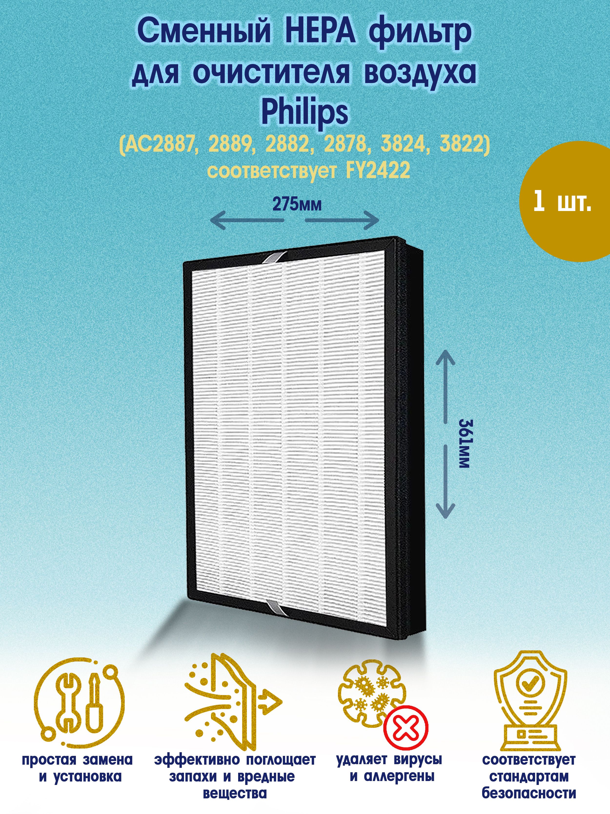 Сменный HEPA фильтр для очистителя воздуха Philips (AC2887, 2889, 2882, 2878, 3824, 3822) соответствует FY2422, 1 шт, 275х361 мм
